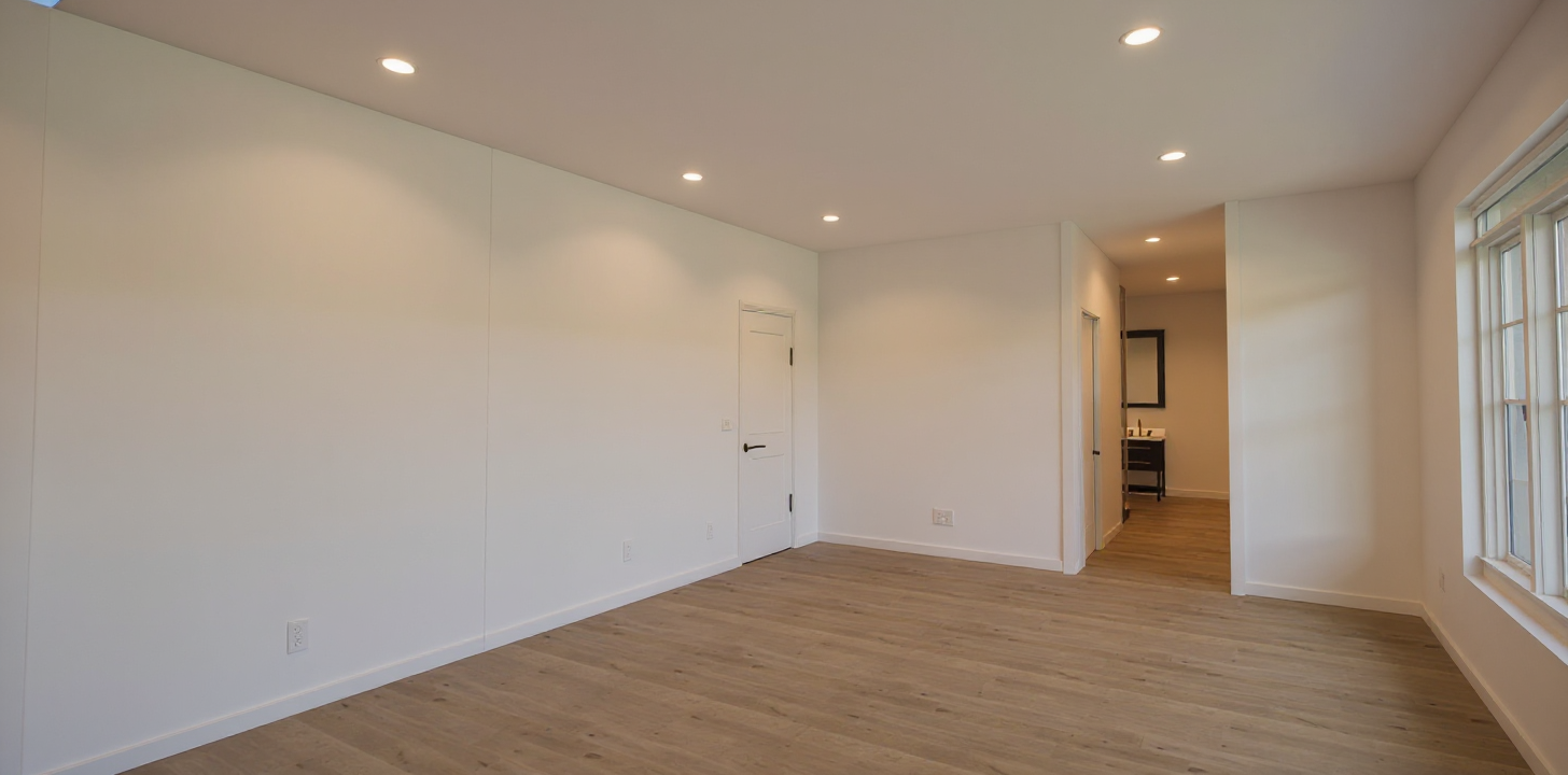 modify this modern residential exterior rendering add a clean concrete driveway in front of the garage door on the left replacing the existing landscaping remove all landscaping elements along the facade replace the floor to ceiling window to the left of the main entry door with solid exterior wall material that exactly matches the surrounding facade keep all other architectural details lighting fixtures colors and proportions the same the overall style should remain modern and cohesive