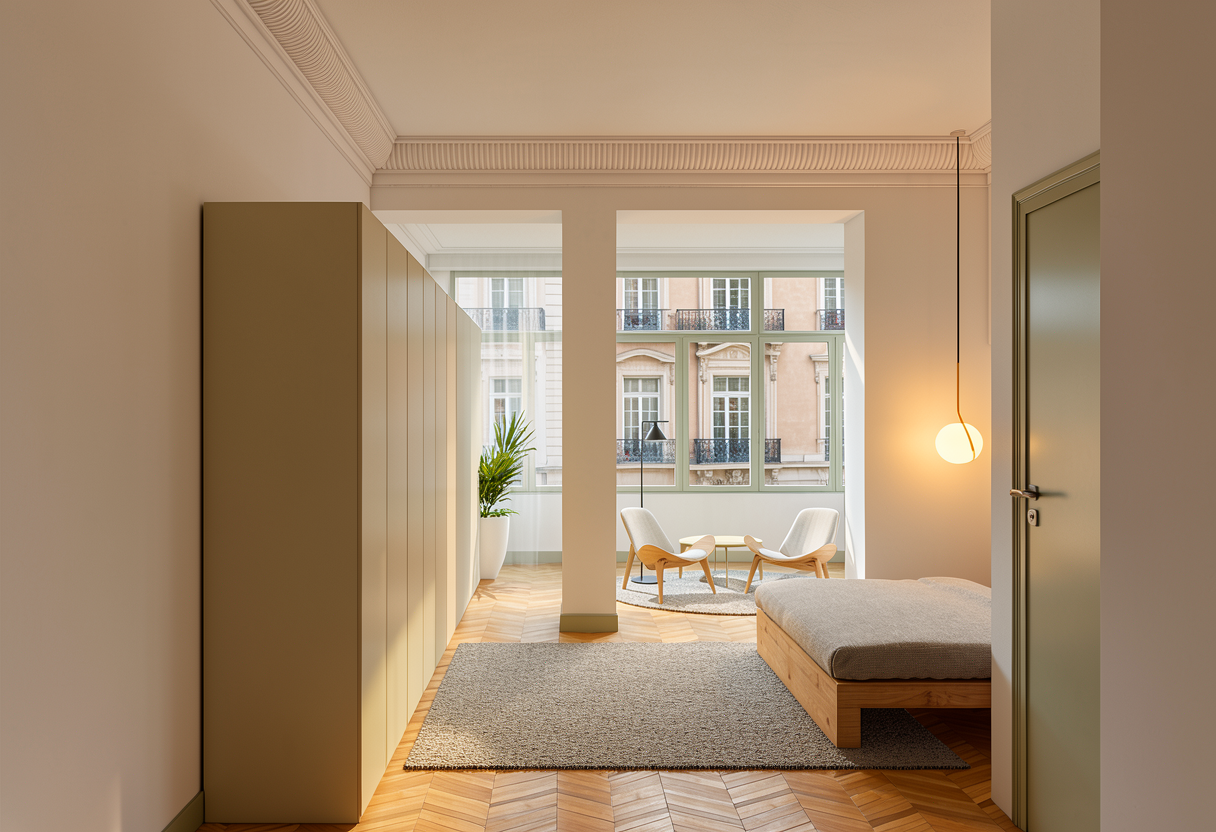 1 keep colours 2 place a frontal ugly building facade in the background and close to the windows 3 add light in the suspended lamp like the flos ic lamp 4 lighting morning natural light