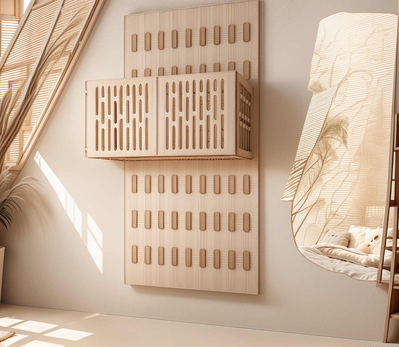 interior shot modern architectural structure a rectangular extension with vertical slits protruding from a flat wall adorned with rows of rectangular cutouts the extension is metallic silver with reflective surfaces casting soft shadows the main building wall is painted a sleek matte white adding a minimalist aesthetic the atmosphere is serene and futuristic basked in soft daylight with gentle shadows evoking a sense of innovation and contemporary design architecture