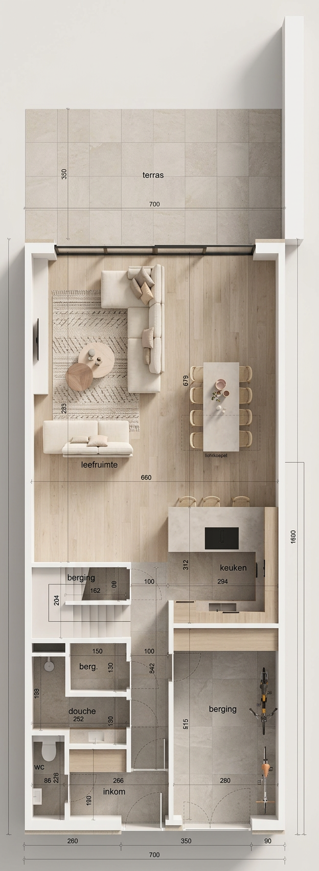 convert this floor plan into a realistic isometric 3d view of a full house show the space from an elevated angle with furniture walls and details visible analyze the provided floor plan generate the provided floorpan 2d residential floor plan into a high quality 3d isometric top down true 90 orthographic architectural photorealistic rendering floor plan of the entire plan keeping the exact same dimensions keep exact proportions keep exact walls keep exact doors keep exact windows and keep exact furniture placement setup as shown do not show dakkoepel do not change kitchen setup do not change layout structure scale and orientation keep terras open style interior modern japanese japan with a soft neutral color palette of beige cream and light wood tones pavement light grey sandstone tile 60x60cm living room in parquet light oak light natura warm neutral tones beige off white soft grey minimalist furniture clean lines built in cabinetry stone or microcement surfaces matte black accents furnish the existing rooms in a modern aesthetic elegant interior light soft ambient interior lighting and soft natural daylight with subtle shadows architectural visualisation distortion no added or removed elements keep the tops of the walls cleanly cut and white to show the layout clearly show dimensions and text on top in white use the same furniture as shows on the plan do not change the orientation of the floorplan