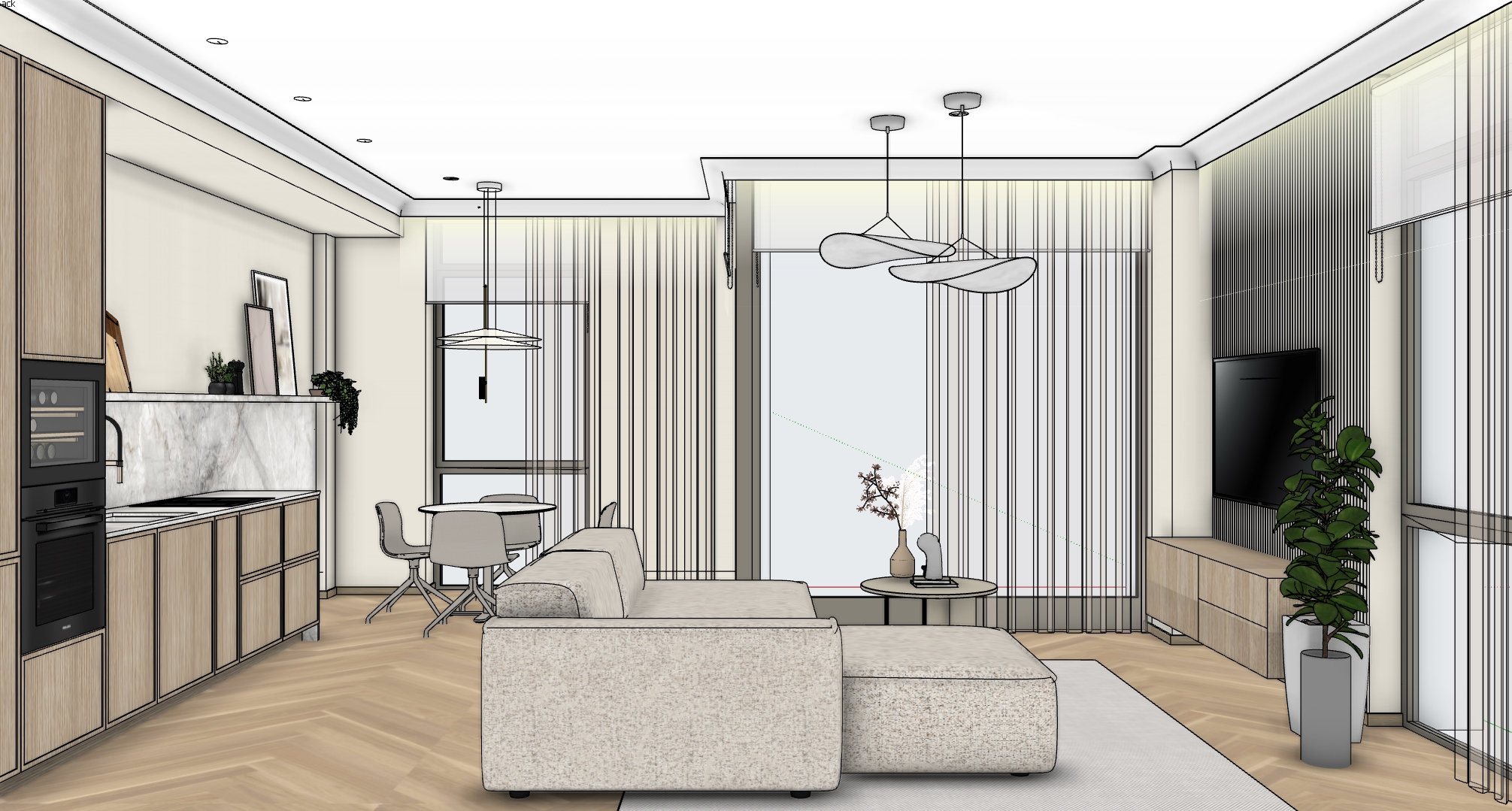 dont change any textures or colours modern living room interior with a cozy and sophisticated atmosphere the room features a light beige sectional sofa with textured fabric positioned in front of a sleek minimalist tv mounted on the wall the walls are adorned with subtle vertical line patterns in shades of taupe and cream to the left a contemporary dining area includes a round white dining table with four matching chairs in a soft gray color large floor to ceiling windows allow natural light to flood the room creating a warm and inviting ambiance the floor is a herringbone patterned light oak wood enhancing the elegance hanging above the living area are sculptural pendant lights in matte white a touch of greenery is provided by a few potted plants infusing the space with freshness render with soft lighting to highlight the textures and create a serene inviting atmosphere