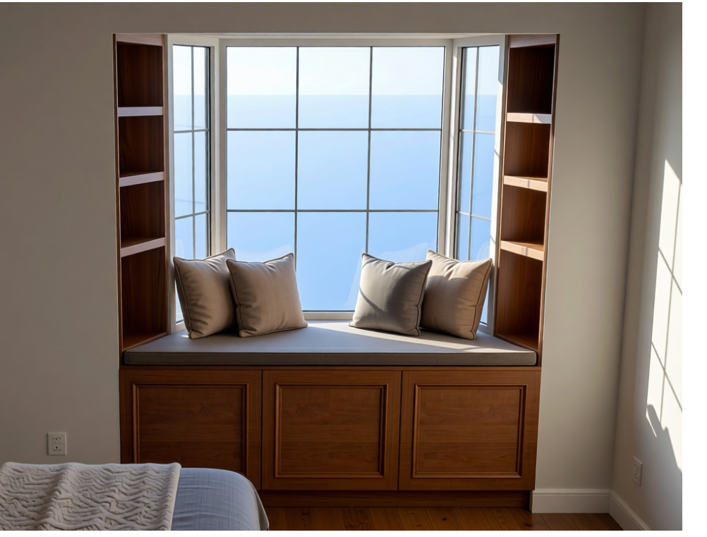 make the bay window square instead of trapezoidal getting rid of the side windows but keeping the large center window and extending the book shelves to the corners of the large window