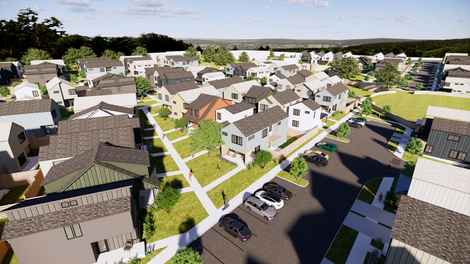 new urbanism aerial shot beautiful neighborhood sunny day people walking by architecture