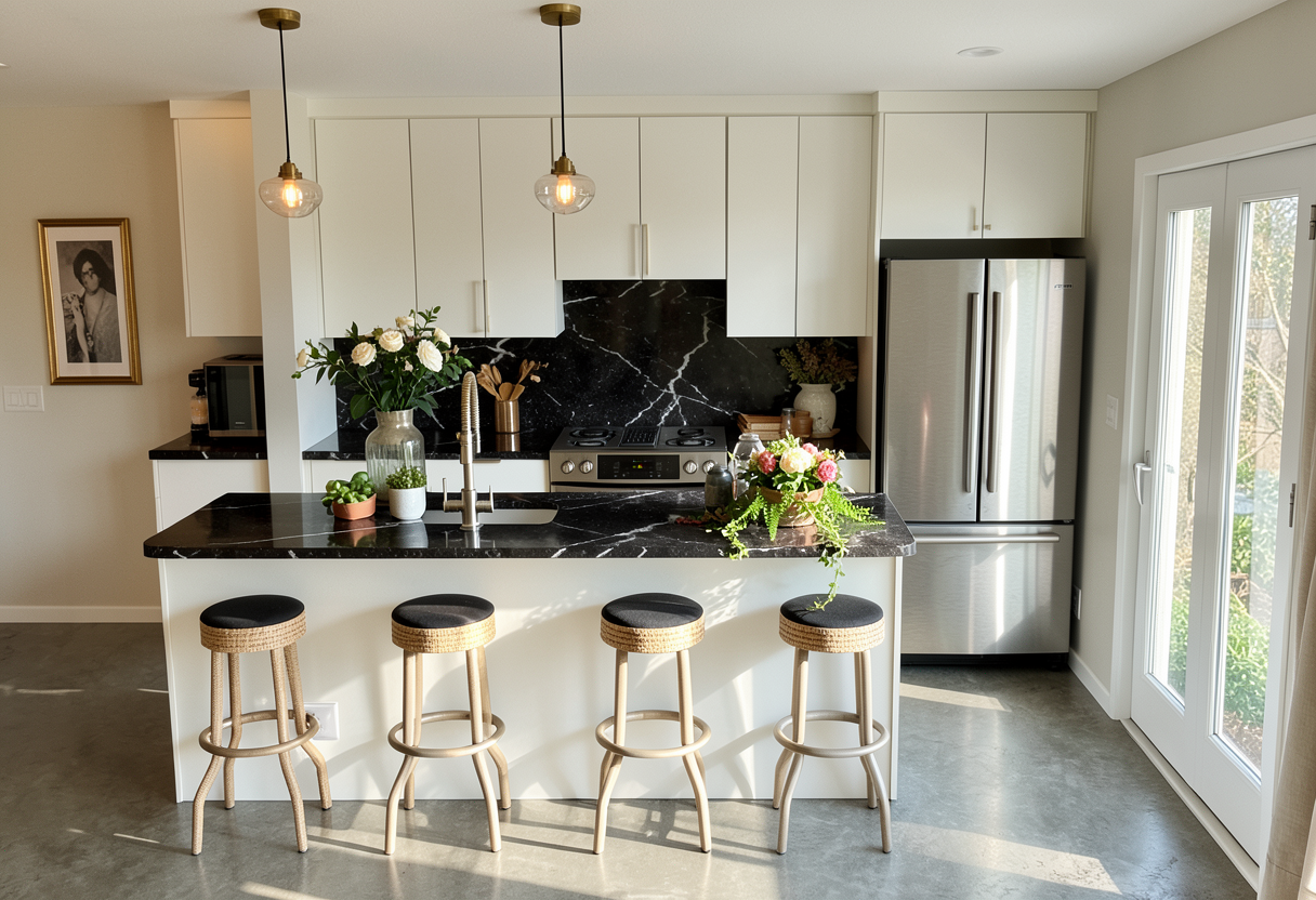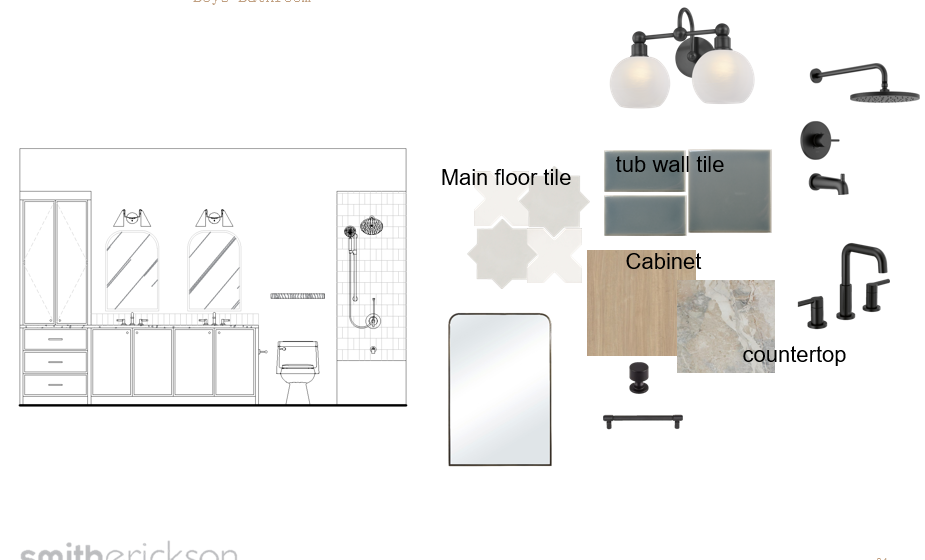 modern zen boys kid bathroom tub has the blue tiles stacked per elevation layout main floor is checkered with geometric tile layed out all fixtures are black toilet it white walls are painted warm white cabinet is painted the wood chip