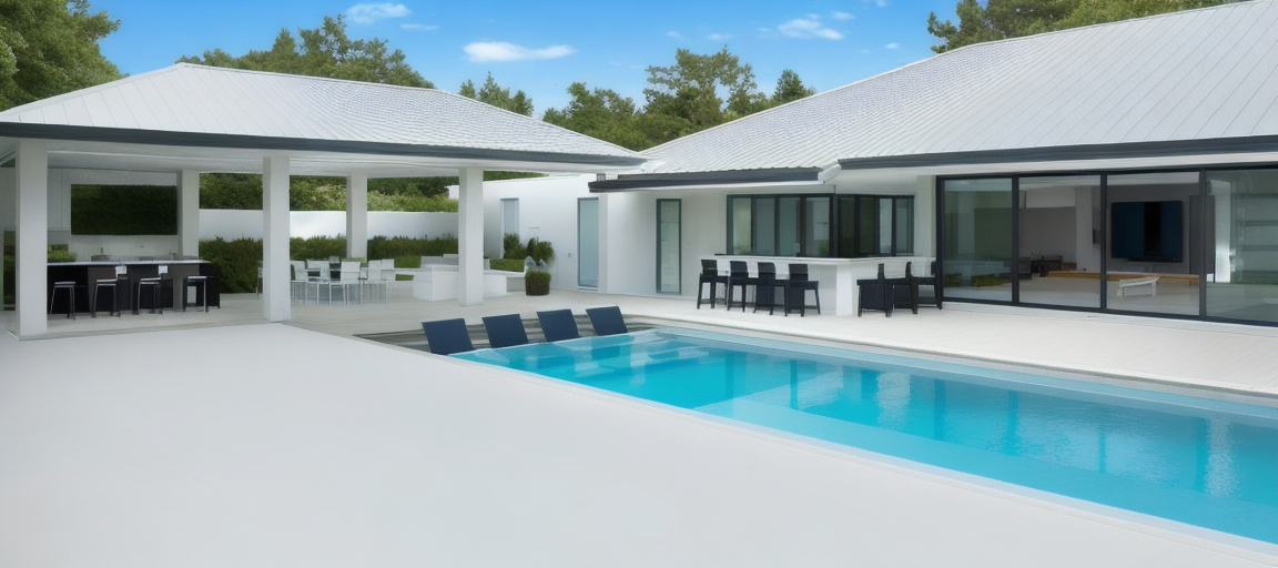 a beautiful modern ranch style house set against a clear blue sky with soft white clouds the house features a dark charcoal gray roof and stone gray walls the wooden panels are a rich walnut brown adding warmth to the design large elegant windows have black frames with a modern touch the front door is a welcoming sturdy mahogany emphasized by a charming wooden porch structure surrounding the house is a lush green lawn perfectly manicured creating a peaceful inviting atmosphere bright natural lighting enhances every detail giving the scene a serene and idyllic ambiance sidewalk to entrance from the garage on the right side of the home