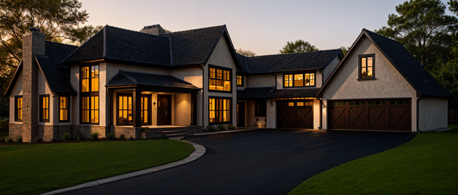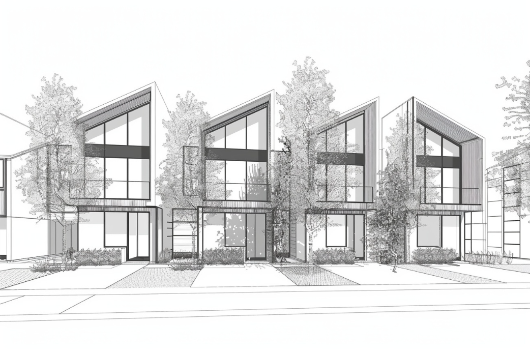 two story modern residential building simple rectangular forms pitched gable roof smooth white stucco exterior large rectangular windows minimal detailing clean facade with shadow depth landscaped sidewalk with low shrubs bright daylight photorealistic architectural rendering