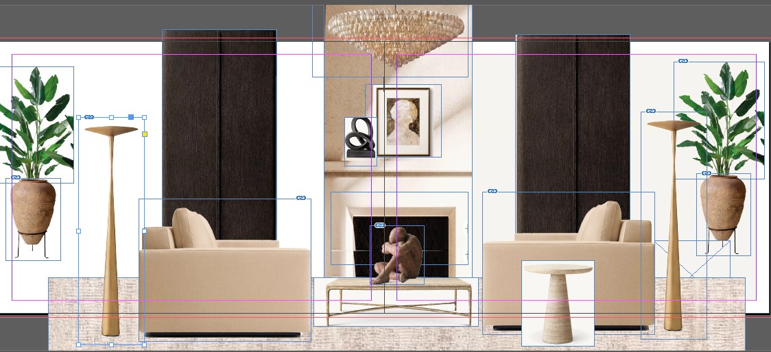 luxury modern french home with french doors on left wall leading to a terrace with a view la hills and right foyer sofa table behind each sofa with floor lamp on each side have all lights glowing on scale furniture