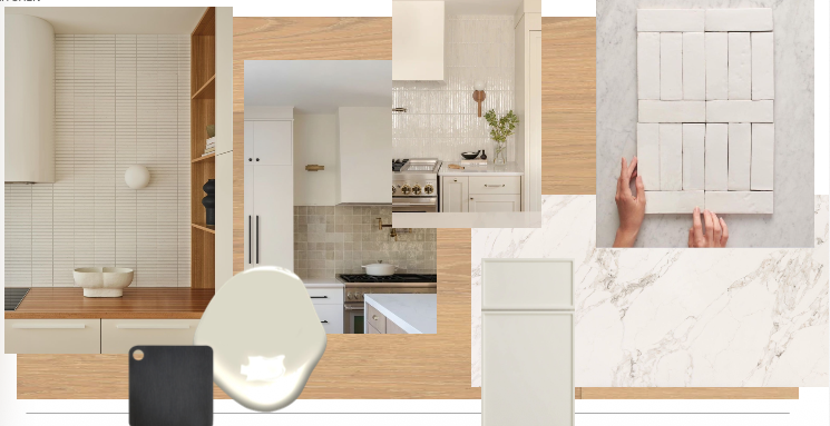 remove all paint swatches floating material samples and background collage elements clean up the composition into a single cohesive kitchen scene with a clear focal point enhance the kitchen into a realistic high end residential rendering improve lighting to feel bright natural and slightly warm with soft shadows and depth refine materials such as cabinetry countertops backsplash tile and fixtures to look modern clean and premium ensure the design feels cohesive minimal and well balanced final result should look like a polished kitchen in a modern home listing or developer presentation do not include any sample boards or collage elements