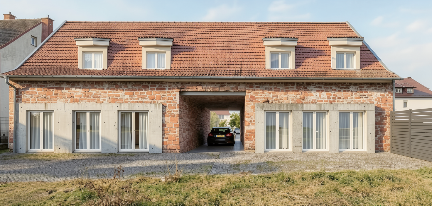 dit the existing render image quality improve overall image quality remove grain and noise the image should look clean and sharp car improvement improve the car details and proportions fix the license plate so it looks clear and natural exposed concrete modulation correction correct the concrete panel modulation replace the current pattern with rectangular formwork panels not square panels should be medium to large scale with a clean and simple layout joints must be aligned and realistic with subtle formwork marks the concrete must look natural with slight variation and no repetitive or unrealistic pattern important do not modify architecture colors or composition only improve image quality car realism and concrete modulation photorealistic high detail