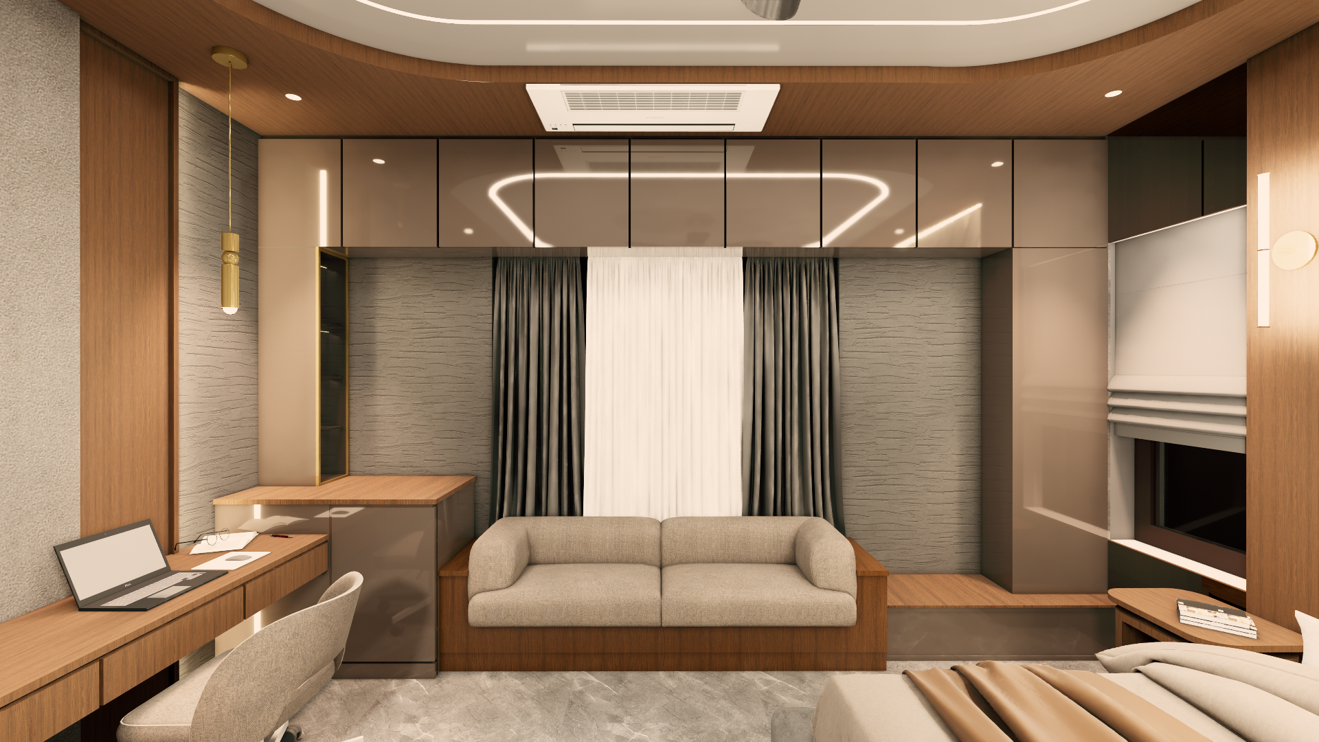 make the headoard headboard fabric and grooves realistic and make changes in colors if required to the room with the color pallete walnut wood medium and dark grey beige and brass metal and let the room look dark but cozy and make it look realistic
