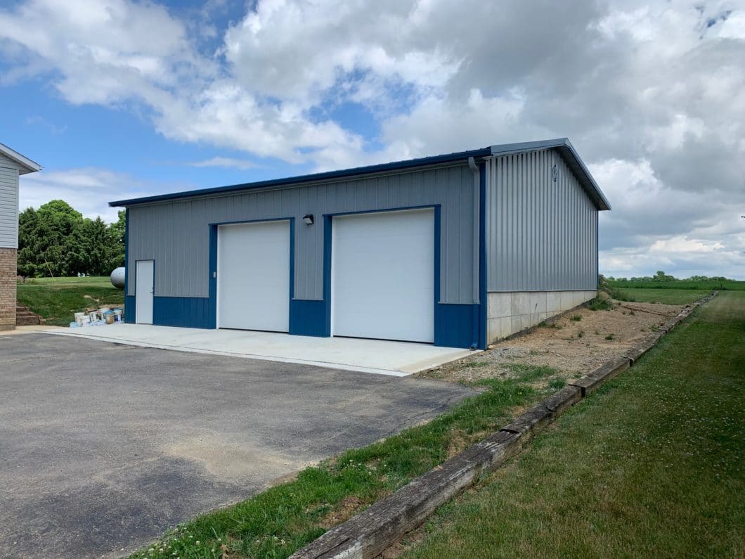hyper realistic minimalist cobalt blue walls and bone white roof and bone white doors metal house steel iron frame construction with gable roof style large garage door on the front countryside scenery surrounded by green grass and trees beautiful clear blue sky full view architecture