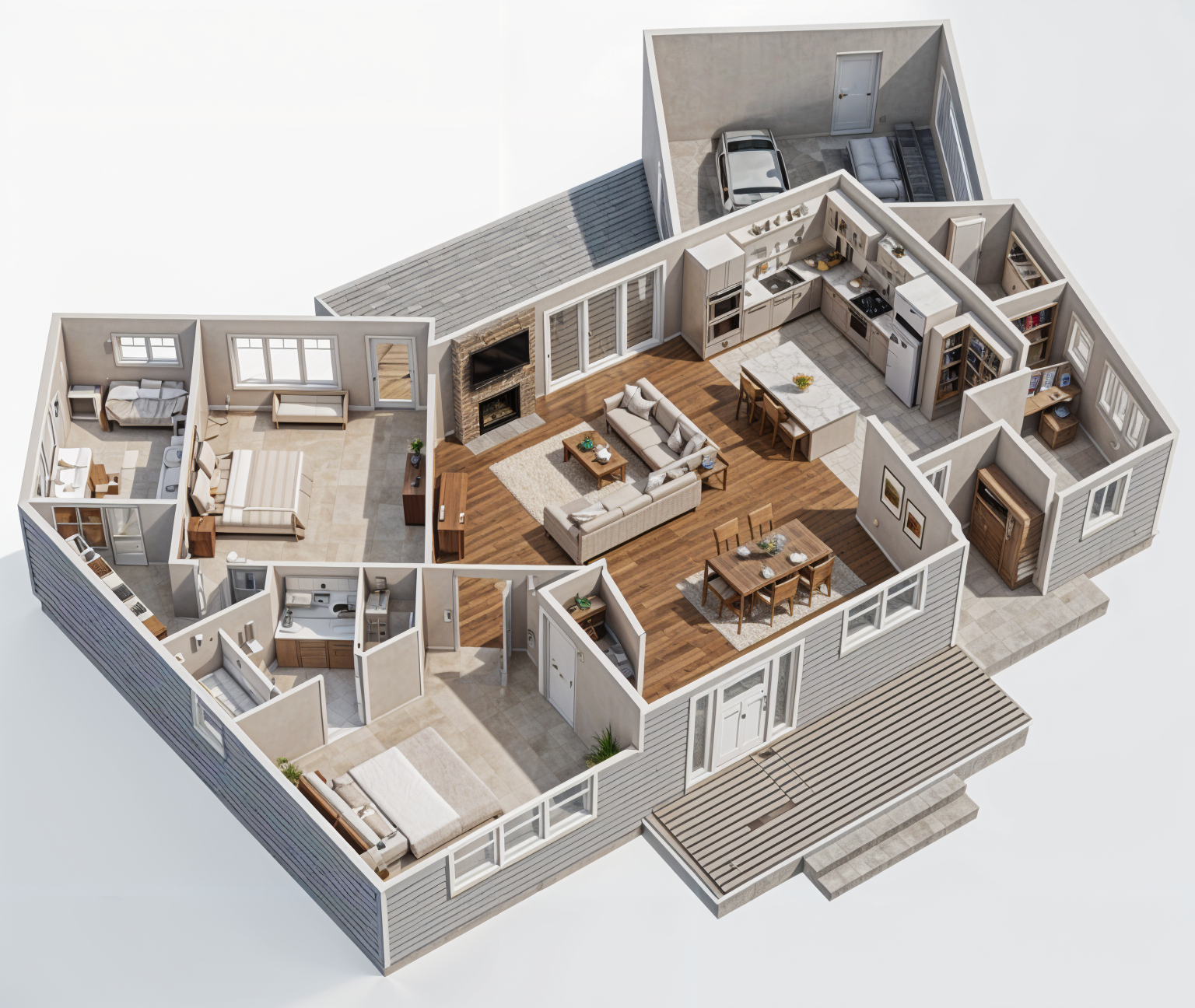 change to early morning lighting with soft clouds eliminate interior lighting