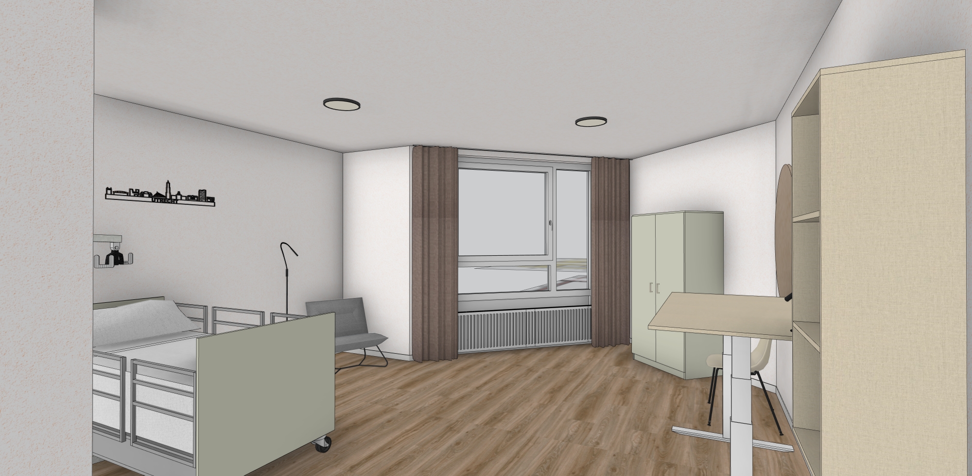 maintain all colors natural daylight ouside small city skyline utrecht schience park turn lights on table top and cabinet are textile beige from egger cabinet in the back and bed ends are sage green from egger make as photorealistic as possible
