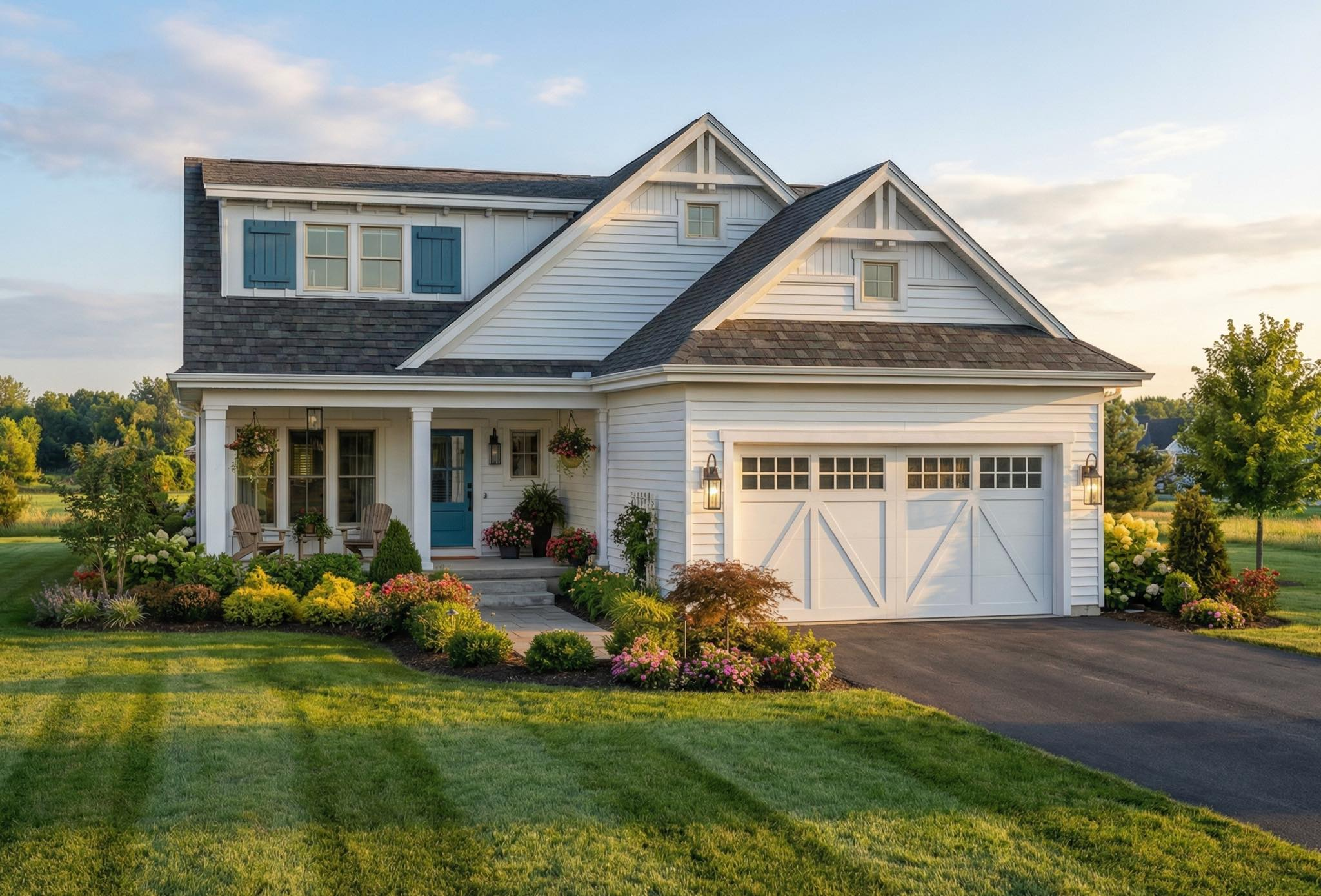 show a young femal realtor handing over the keys to the man in the reference photo there is a for sale sign in the yard with a sold sticker overlaid on it the two people are smiling and looking at the camera the man holds a document that says free house on it