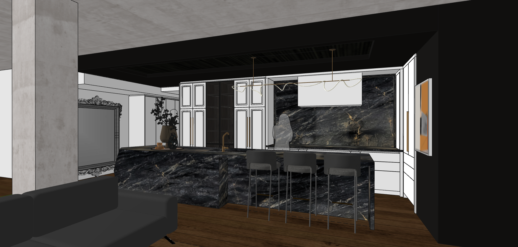 render this contemporary kitchen architectural render while keeping all architectural volumes cabinetry layout proportions and materials exactly as shown do not modify the design millwork configuration island dimensions hood bulkhead ceiling details or overall composition maintain brutalist stone island the stone should read black with gold veins white cabinetry the glass door cabinets have a black stained oak interior back wall in stone like the island the stone should read black with gold veins toned brass faucet and metal accents dark wood flooring lighting upgrades only no design changes add warm integrated led lighting 2700k 3000k inside the glass cabinets shelves should be glass filled with glassware put soft lighting under the hood and from the ceiling on both sides of the hood enhance the sculptural pendant so it emits a soft warm diffused glow elegant not harsh introduce subtle ceiling spotlights that graze the stone slab and highlight material texture without flattening it mood atmosphere create a chic warm sophisticated ambiance the space should feel intimate refined and quietly luxurious lighting should emphasize contrast between the deep cabinetry and the luminous marble island the brass should feel brushed and softly reflective never shiny or brassy overall feeling a high end editorial interior photograph moody yet welcoming dramatic but balanced refined warm inspiring avoid changing materials changing finishes changing proportions overexposing highlights cool lighting temperatures adding new decorative elements render as a photorealistic cinematic interior shot with depth soft shadows and natural light falloff
