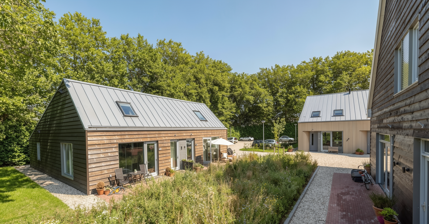 contemporary style black windows cream stucco cedar colored lap siding metal roof add driveway and landscaping