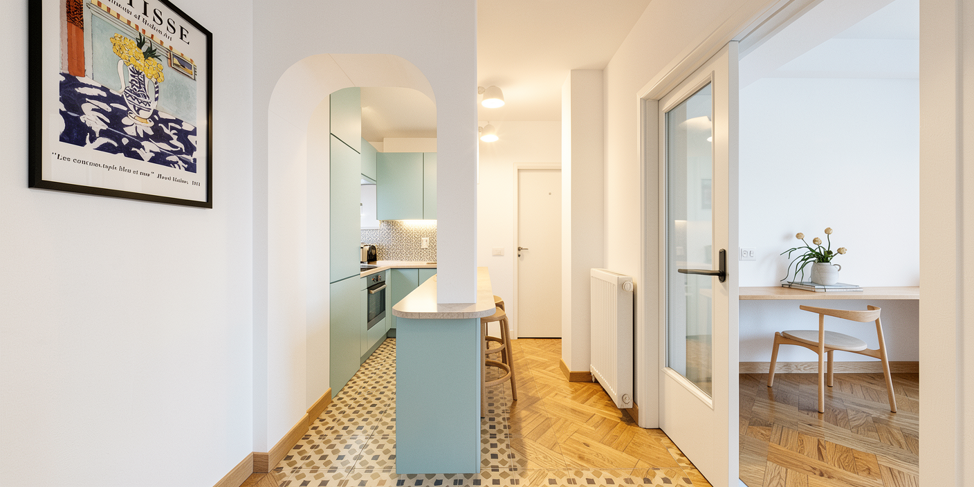 create a realistic rendering of a two story modern suburban house the house should have a mix of white and darker grey siding with dark grey accents on the windows and garage doors the roof is dark grey and there are dark grey window frames surround the house with some light landscaping and a lush green lawn the sky is dreamy with light fluffy clouds and a romantic blue sky indicating a sunny day the atmosphere is serene and inviting capturing a warm welcoming suburban environment