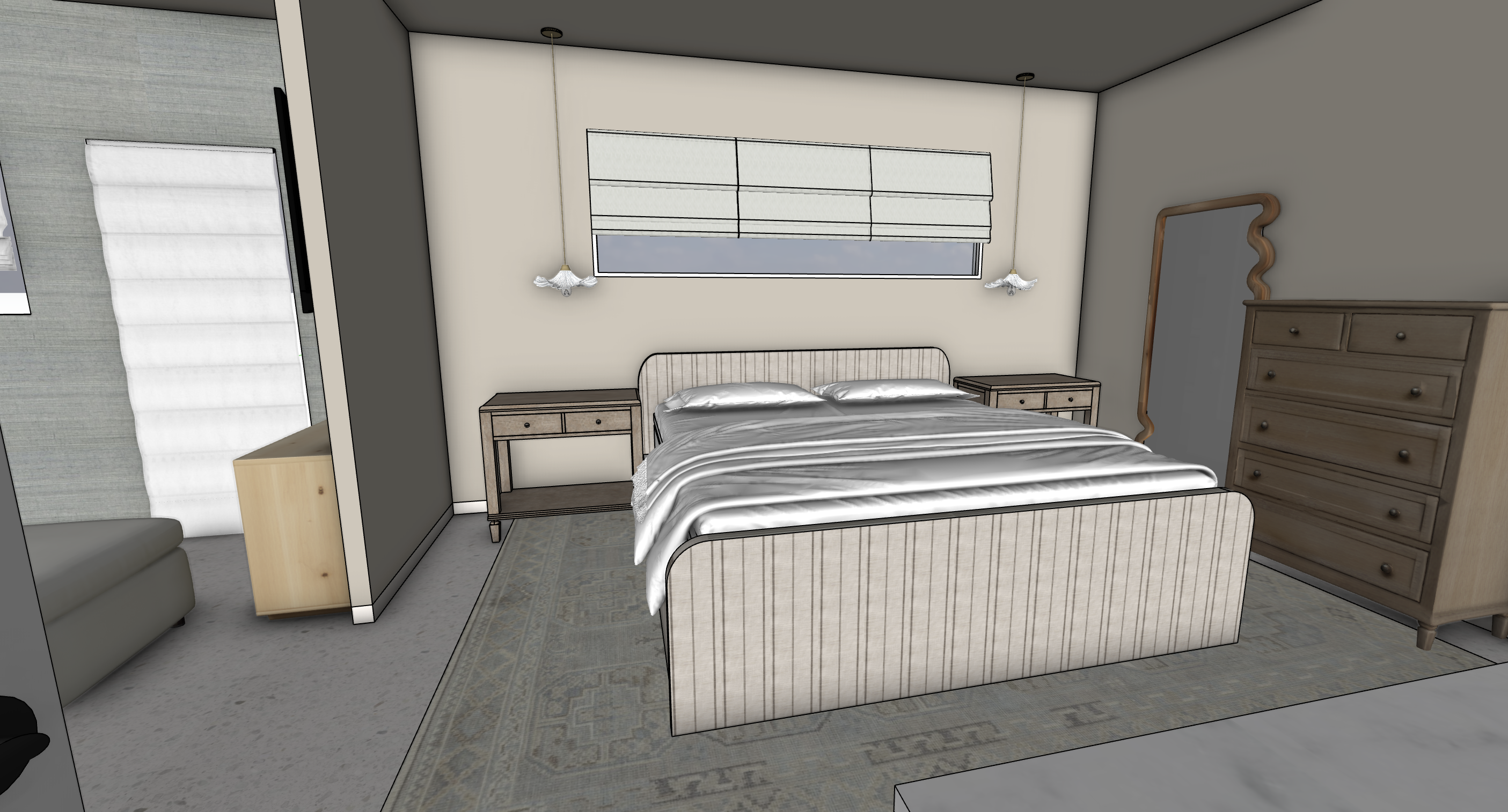 a cozy bedroom with a modern minimalist style a king size bed with a light beige upholstered headboard and white bedding two wooden nightstands with a rustic finish next to the bed both with vintage metal handles a large window with soft white roman shades allowing gentle light to filter in a tall wooden dresser with a warm oak finish stands against the wall a full length mirror with an ornate wooden frame leans casually reflecting the soft lighting the walls are painted in a soothing light gray adding to the tranquility a plush area rug in muted tones of blue and gray lies beneath the bed complementing the serene atmosphere the space is elegantly minimal with subtle touches of warmth