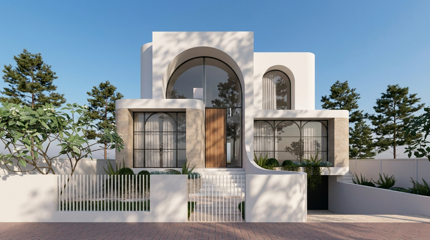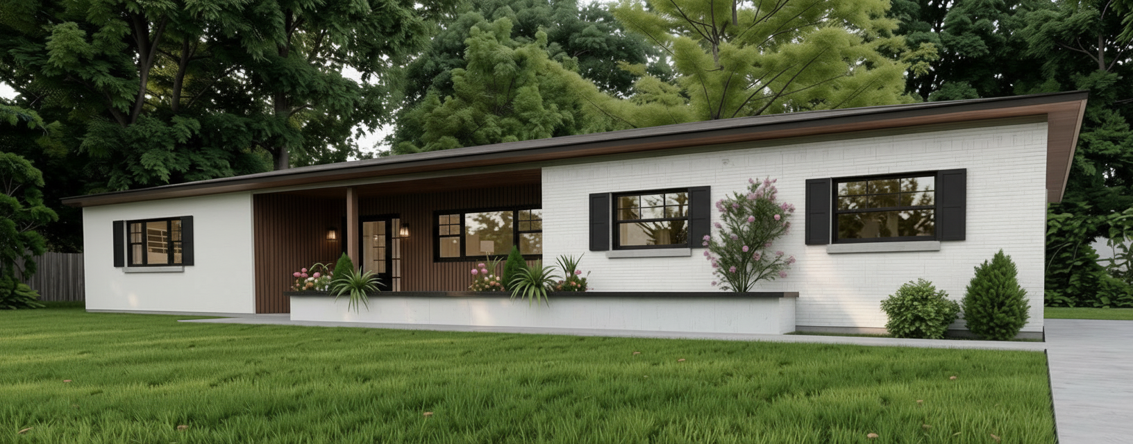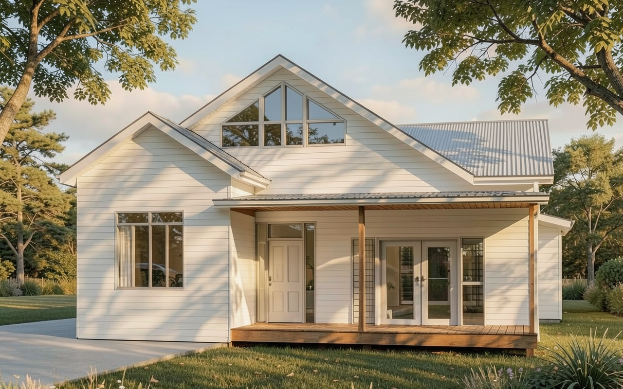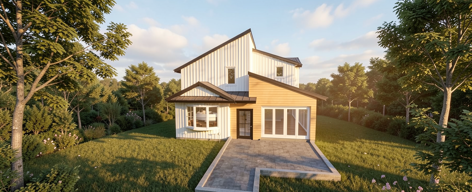 add in scattered pine trees in the background with smaller shrubs underneath their canopy add in dappled lighting projecting on to the house add in sheers to windows left and right of the front door maintain all house materials