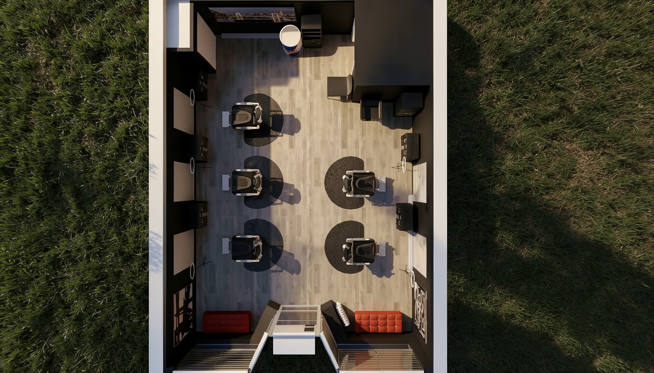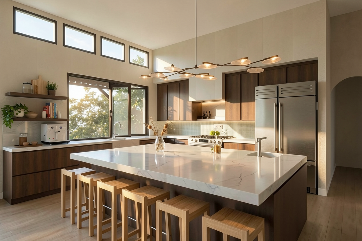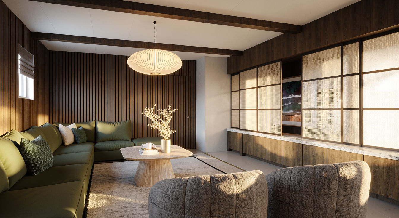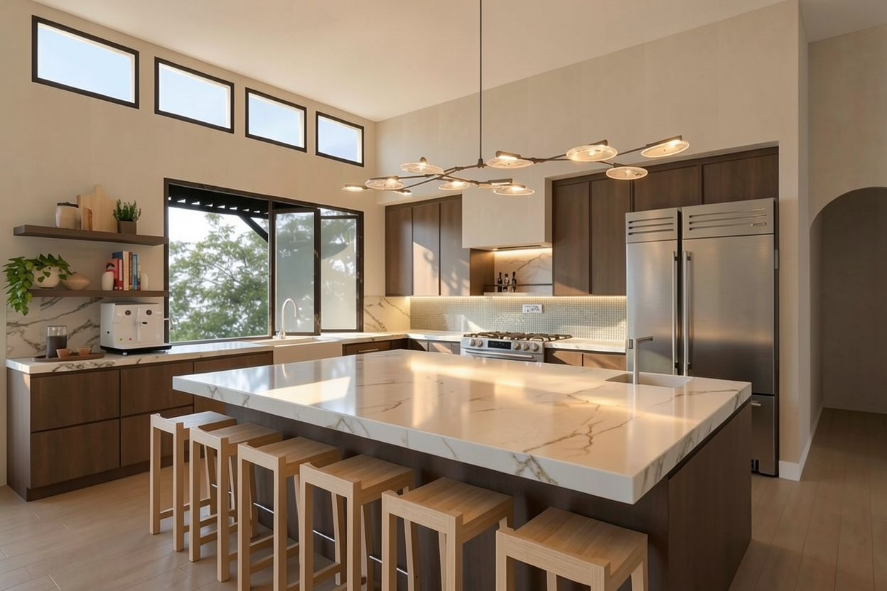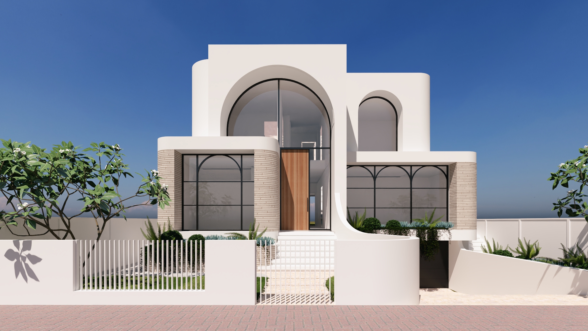 add in scattered pine trees in the background with smaller shrubs underneath their canopy add in dappled lighting projecting on to the house add in sheers to windows left and right of the front door maintain all house materials