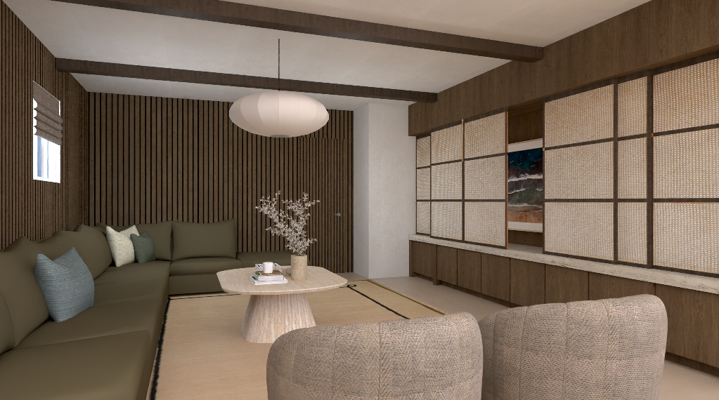 living room rendering t v built in media wall has sliding screens that can move back and forth
