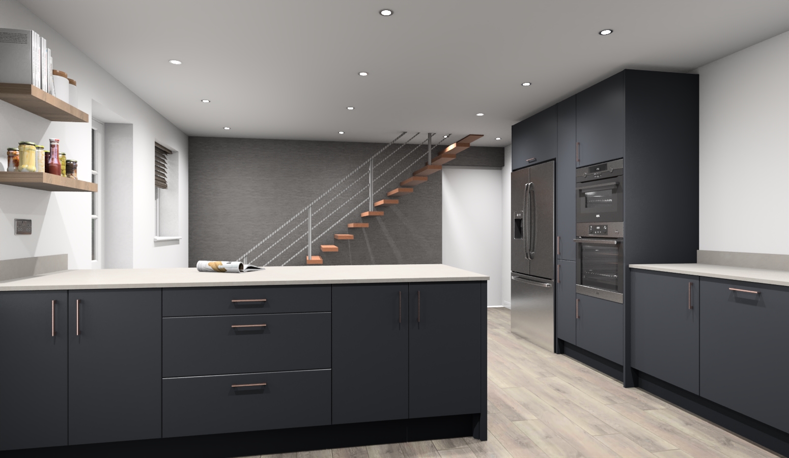 make this image 8k hyper realistic as if it were taken via an iphone camera artificial lighting should beautifully blend with natural lighting showing the subtle grain effect on the painted ash kitchen door keep dimensions the same and in a landscape format keep dimensions the same midday sunlight coming through large windows casting realistic shadows and reflections shot with a dslr camera 35mm lens shallow depth of field ultra high resolution photorealistic ray tracing global illumination highly detailed textures realistic lighting cinematic composition