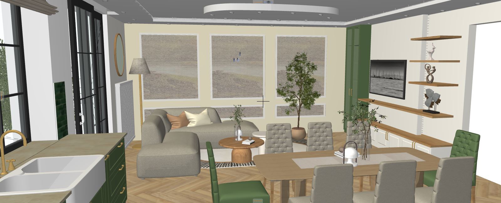 k sz ts leny g z fotorealisztikus nappali k pet dekor d l sd el rejtett f nyekkel a mennyezeti dobozol s felett a magas szekr ny polcai vil g tsanak s legyenek benne t rgyak
