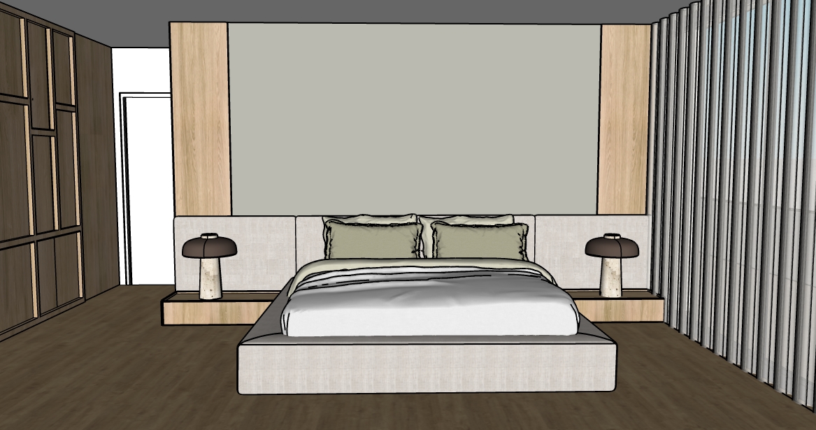 modern living room with elegant design neutral tones and a serene atmosphere the plush sofa features textured beige upholstery with hints of taupe and cream the wall is adorned with sleek light wood paneling and a minimalist black shelving unit showcasing decorative vases lush potted plants with vibrant green leaves add a touch of nature expansive windows reveal a blue sky filling the room with natural light the wooden furniture pieces are a warm walnut shade and the overall ambiance is calm and inviting