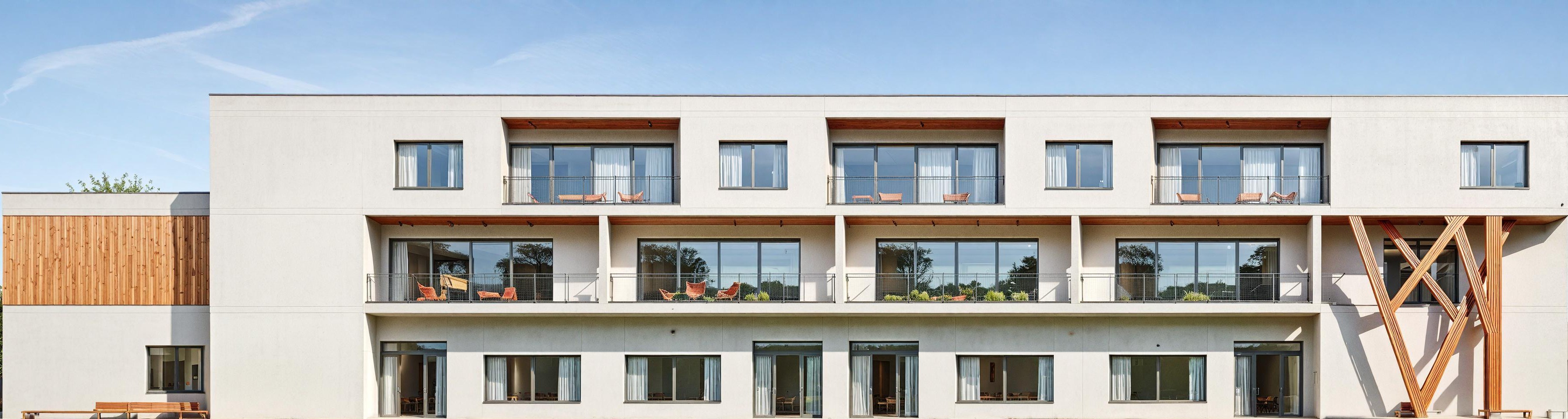 make a black and white architectural drawing of this render make sure to emphasize the building outlines and depth through different line thickness