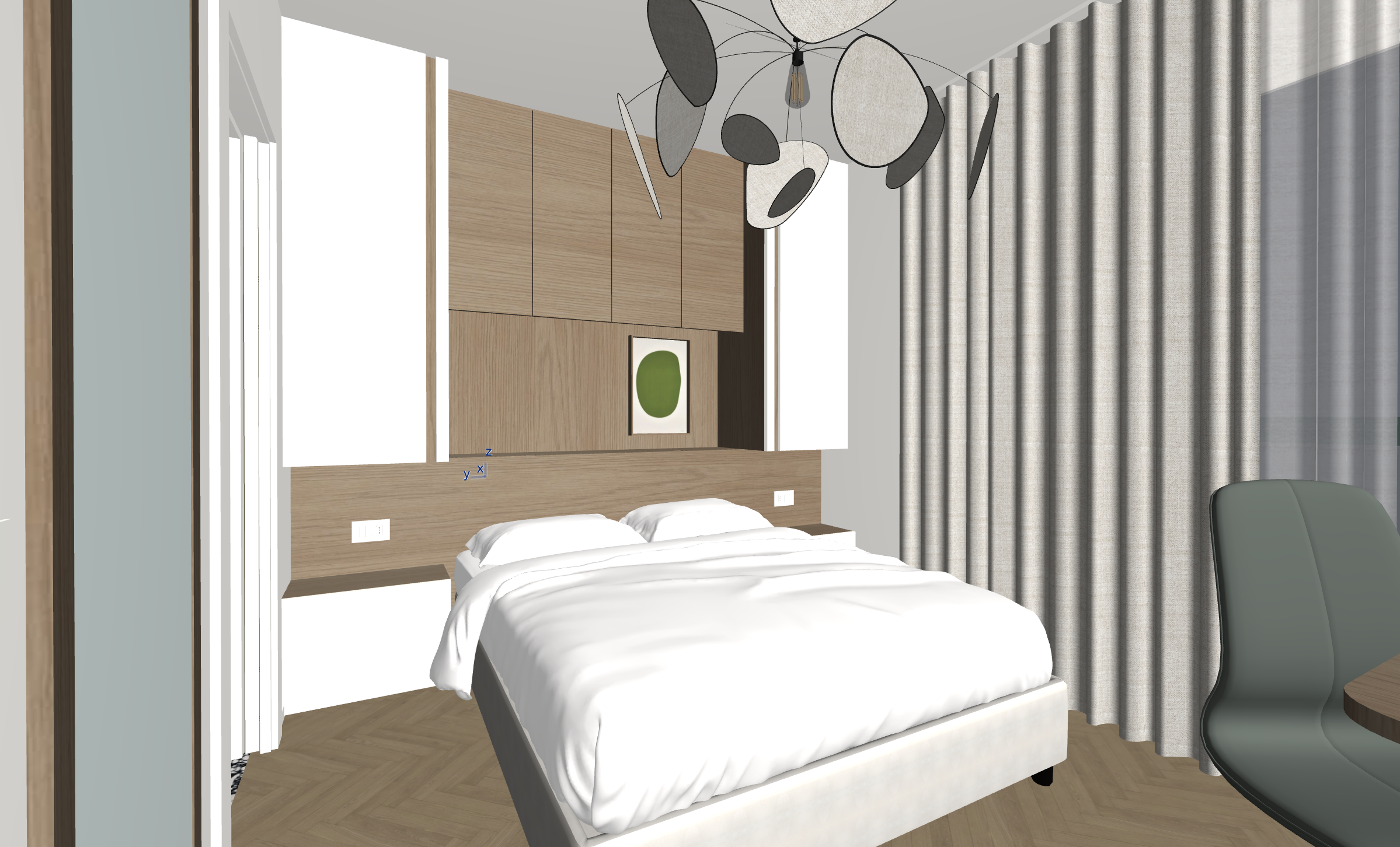 modern bedroom with elegant minimalism featuring a wooden accent wall in light oak a large comfortable bed with crisp white linens is centrally placed above a contemporary chandelier with black and white abstract shapes adds sophistication the walls are white harmonizing with the light curtains that allow soft daylight to filter in creating a tranquil atmosphere a subtle green abstract painting adds a pop of color above the headboard the dark teal chair adds an accent of color while the flooring is warm light wood in a herringbone pattern enhancing the cozy yet modern vibe
