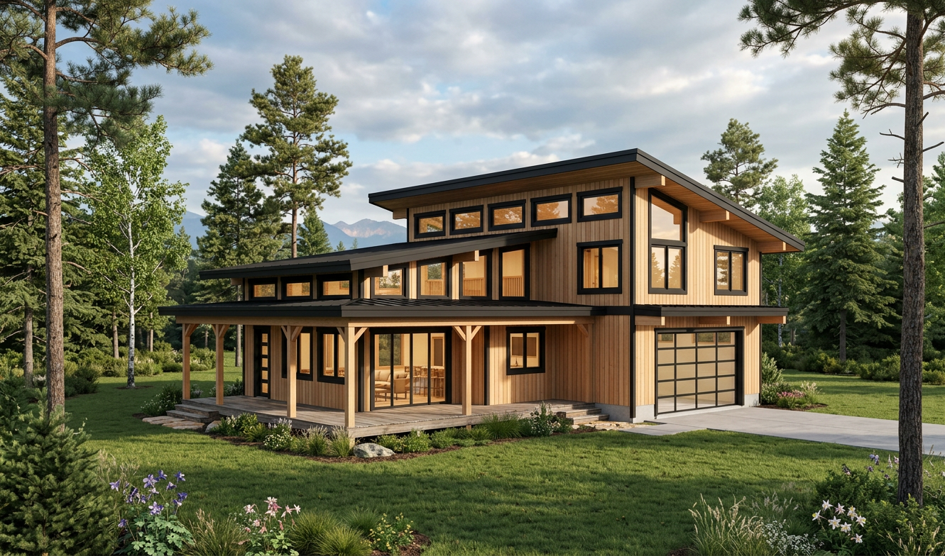 render this home on a hillside with surrounding houses insert native california plantings in the front yard only retain the concrete walk along the side to the back retain the black shingle roof and window styles