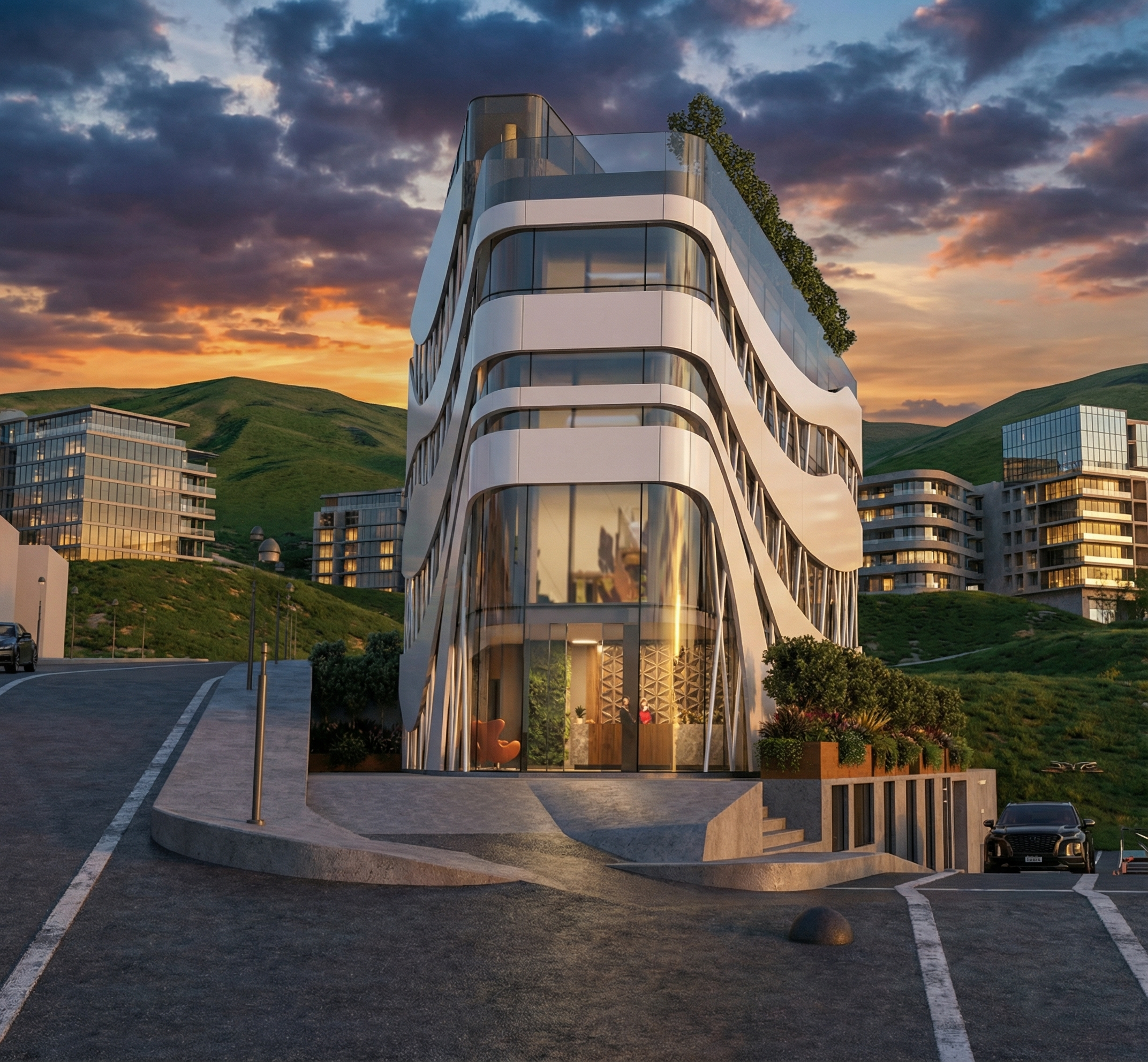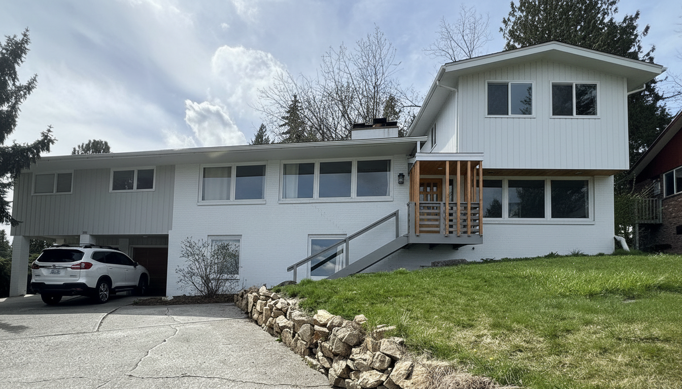 create high resolution photorealistic vibrant photo with plush trees and bushes with vibrant blue sky keep all details exact as original create a fresh spring settings green grass brick to be alabaster white with charcoal shutters door color garage door same color as shutters