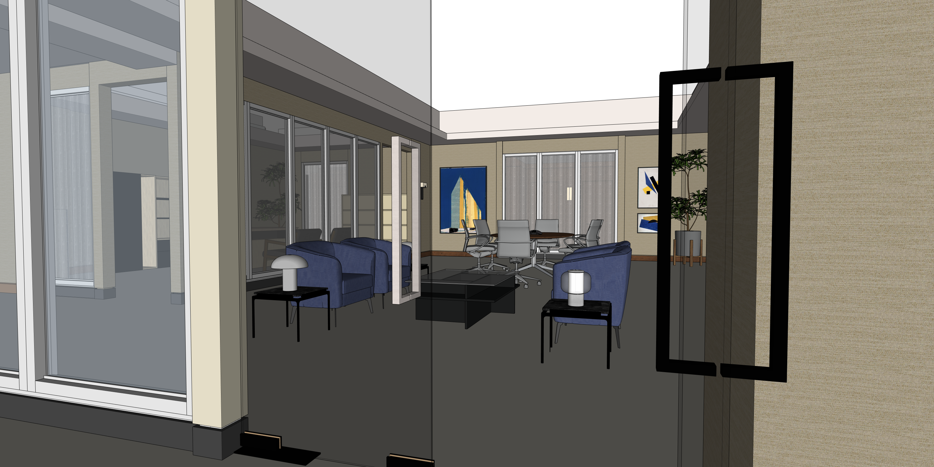 a high end corporate office there is no natural light soft overhead light carpet flooring
