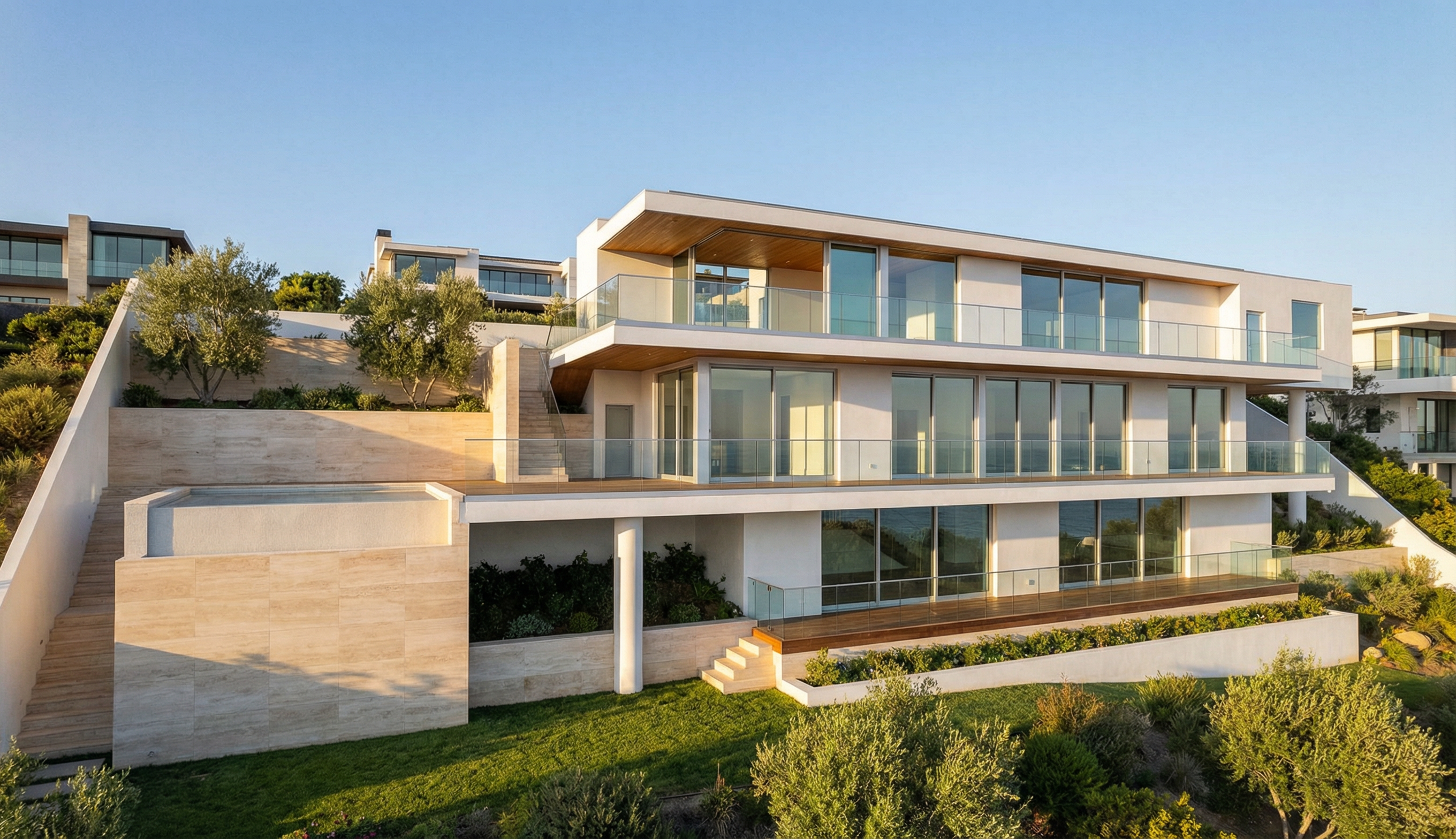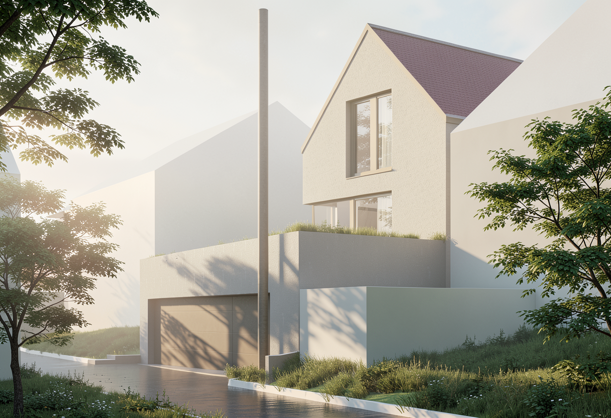 generate a photorealistic architectural perspective from the provided 2d elevation respecting all geometric offsets material specifications and environmental conditions listed below prioritize dimensional accuracy material fidelity correct depth hierarchy and realistic rural lighting 1 massing depth constraints critical geometry reconstruct the building volumes with strict respect to recession distances garage volume right side primary reference plane at 0 0 most forward mass of the building middle volume with three windows recessed 26 0 from the 0 0 garage plane maintain planar alignment across all three windows left volume with patio door window recessed 31 0 from the 0 0 garage plane slightly deeper than the 3 window volume far left covered terrace concrete slab aligned with the left volume covered by the main roof supported by 8 x8 cedar posts exact section size must be visible ensure all volumes are reconstructed with correct parallax vanishing points and shadow projection based on their recession distances 2 exterior materials exact specifications siding maibec board batten snow white finish vertical battens must be visible with correct spacing and shadow depth slight matte texture not glossy roof steel roofing color steel grey subtle metallic reflectance standing seams visible soffits fascia white smooth finish low reflectivity window trims exterior doors white consistent with soffits fascia clean edges no discoloration foundation exposed concrete natural grey tone slight roughness realistic micro texture wood columns cedar warm orange brown tone visible grain natural variation satin finish 3 environmental context location rural countryside typical of outaouais laurentides mixed forest vegetation conifers deciduous trees slight terrain irregularity natural soil grass and shrubs lighting early morning sunrise from the east soft warm reflection on the fa ade long low angle shadows no dramatic hdr effects realism only atmosphere crisp rural air slight morning haze acceptable neutral sky with subtle warm tint 4 rendering requirements perspective true to scale reconstruction from the 2d elevation correct vanishing points and depth compression no fisheye distortion material realism physically accurate pbr style textures subtle micro shadows between battens steel roof must show controlled specular highlights color calibration whites must remain neutral no blue or yellow shift cedar must remain warm and natural concrete must remain cold grey overall style high fidelity photorealism clean sharp architectural grade rendering no stylization no artistic exaggeration 5 output expectations a single perspective view showing the full fa ade accurate reconstruction of all recessions and massing realistic lighting consistent with sunrise faithful reproduction of all materials listed above rural outaouais laurentides context integrated naturally