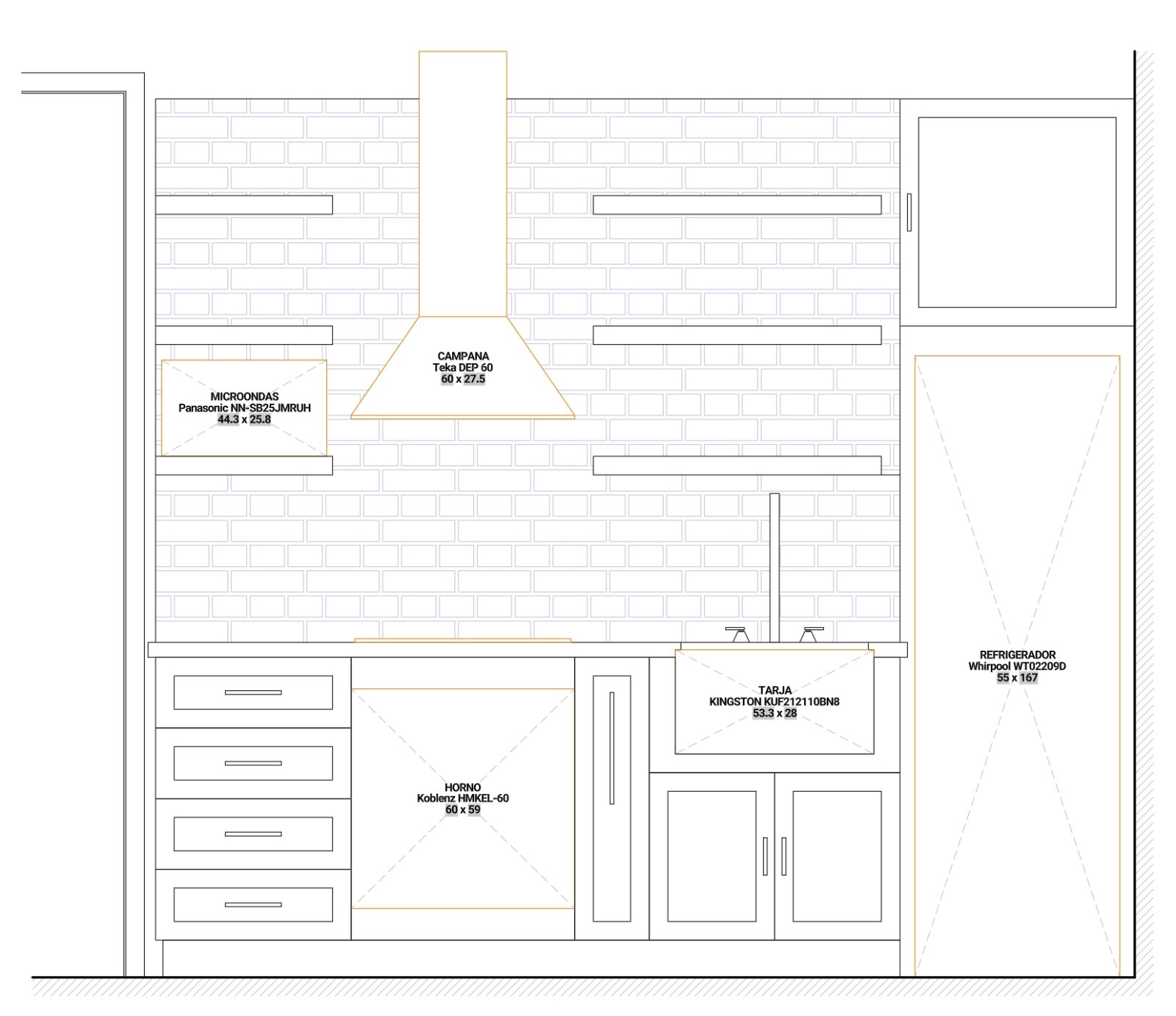 render the uploaded geometry to the left is the door a high end residential kitchen in a modern mediterranean spanish transitional style with a clean warm and cohesive material palette the space should feel refined architectural and balanced not overly decorative layout straight wall kitchen single wall layout with an island centered in front of the cooktop and hood kitchen wall includes from left to right built in microwave countertop workspace cooktop with wall mounted hood centered above additional countertop workspace sink and a freestanding refrigerator at the far right maintain proper spacing and realistic proportions between all elements island size approximately 180 cm 6 ft long 90 cm 3 ft deep 91 cm 36 high positioned centered with the cooktop hood axis includes seating for 2 people on one long side with a 30 35 cm 12 14 overhang island base painted white to match cabinetry countertop same material as main counters no waterfall edges cabinetry shaker style or simple panel cabinets color warm white similar to sherwin williams pure white sw 7005 finish matte or satin countertops material quartz style warm white calacatta with soft subtle veining not bold or dramatic thickness 3 cm or mitered edge appearance backsplash 4x12 inch matte white ceramic subway tile cushioned non rectified edges installed in a traditional running bond pattern grout warm gray greige tone joint size approximately 1 8 inch flooring patterned encaustic style tile spanish mediterranean inspired color palette blue soft white and slightly aged tones the floor should be visually rich and act as the main focal element ceiling exposed wood ceiling with warm tones natural wood planks or beams medium to dark warm brown coloration adds warmth and contrast to the white kitchen appliances fixtures refrigerator stainless steel brushed nickel finish sink undermount stainless steel faucet brushed nickel hood stainless steel or simple modern hood not overly decorative all appliances should be cohesive in brushed nickel stainless tones hardware cabinet pulls and knobs brushed nickel satin finish simple linear bar pulls proportional in size lighting two pendant lights centered above the island finish matte black metal warm light temperature 2700k 3000k optional under cabinet lighting for subtle illumination seating two counter height stools material combination of matte black metal frame with wood seat clean simple design style guidelines maintain a balance between warm and cool tones avoid excessive ornamentation let the patterned floor be the primary visual feature keep backsplash and cabinetry calm and minimal ensure all materials feel cohesive and intentional mood warm inviting architectural modern mediterranean with subtle spanish influence clean elevated and professionally designed not builder grade rendering notes use soft natural lighting include realistic shadows and material textures show full kitchen including island ceiling and flooring perspective eye level or slightly wide angle interior sho