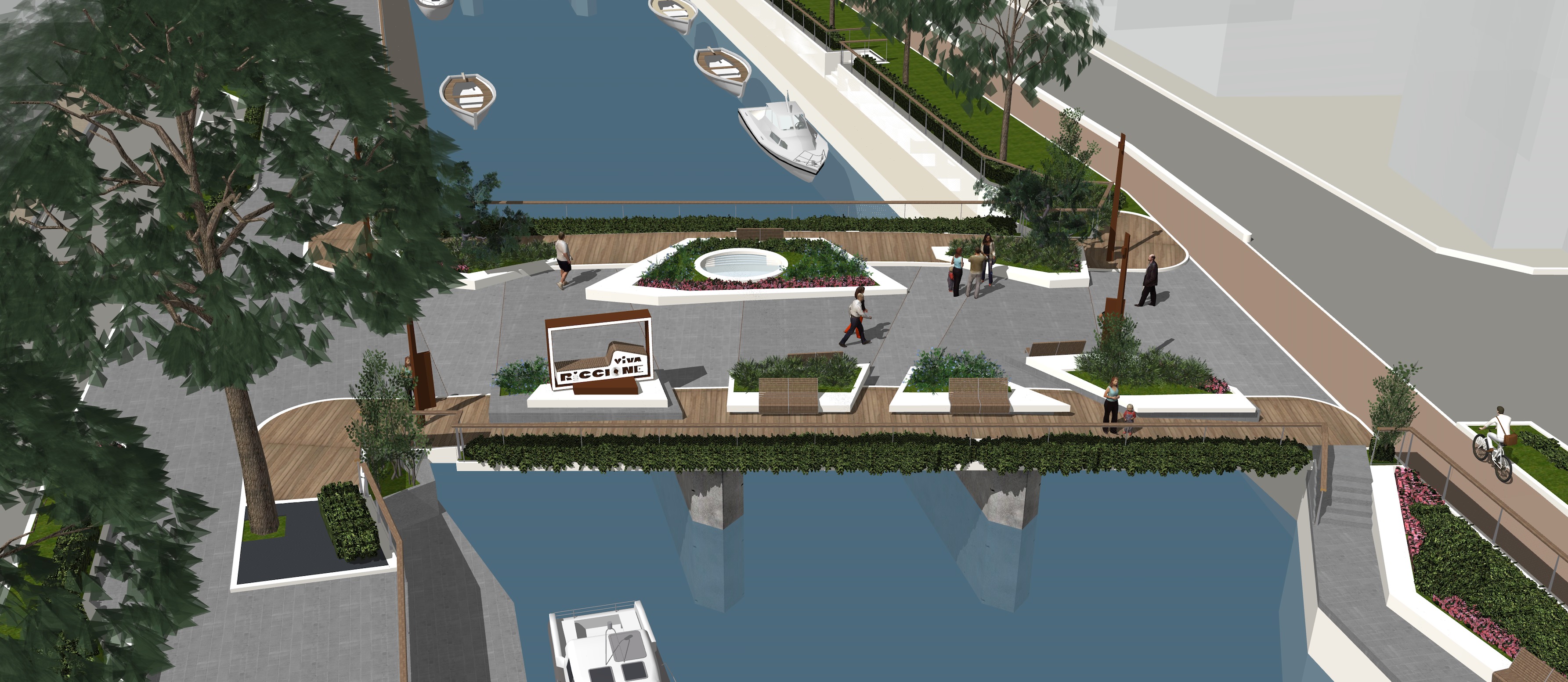 new street furniture on the bridge over the river a beautiful sunny summer day the floor and bases of the planters are made of grey matte granite while the tops of the planters themselves are made of white carrara marble the sidewalks on the long sides of the bridge are paved with teak slats many people walking and talking to each other