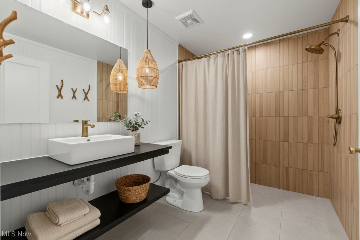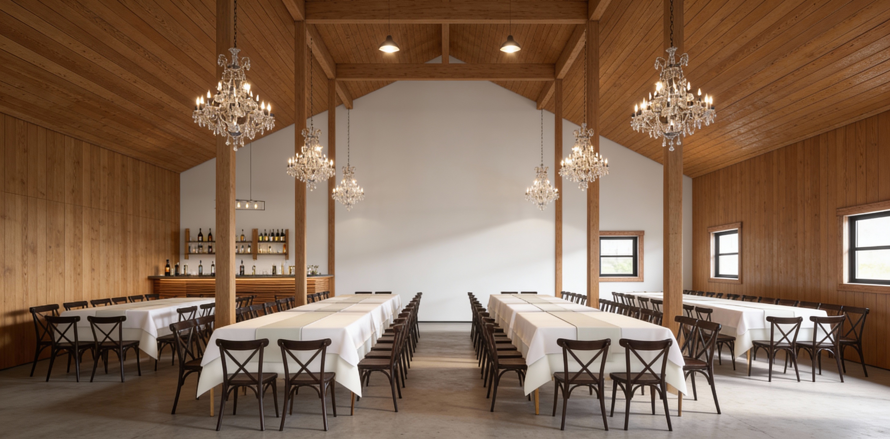 a warm timber interior architectural visualization wide angle wedding space with warm neutral natural wood ceilings vertical timber wall panels oak flooring and daylight filtering through large windows calm and serene atmosphere cinematic interior render soft shadows muted neutral palette scandinavian japandi influence editorial architectural composition calm spatial depth conceptual yet realistic presentation concrete floors white wall in the back with wood walls on the sides