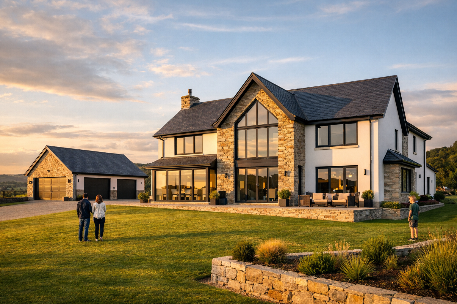 exterior shot use the uploaded reference image only for style guidance remove the existing house shown in the reference image completely and replace it with the house from my base render keep the exact massing proportions rooflines window placements and architectural form of my house do not copy the reference house design match the reference image in terms of camera angle perspective framing focal length and viewpoint match the same time of day sunset lighting conditions sun direction shadows and sky color apply similar materiality color palette surface texture realism and level of detail as seen in the reference image adapted naturally to my house design use the same mood atmosphere contrast and photorealistic quality ensure high realism accurate shadows soft global illumination natural reflections realistic landscaping integration and cinematic sunset lighting the final image should look like a professional architectural photograph taken at golden hour with my house replacing the reference house