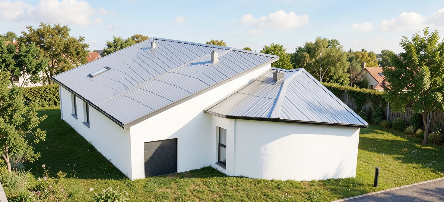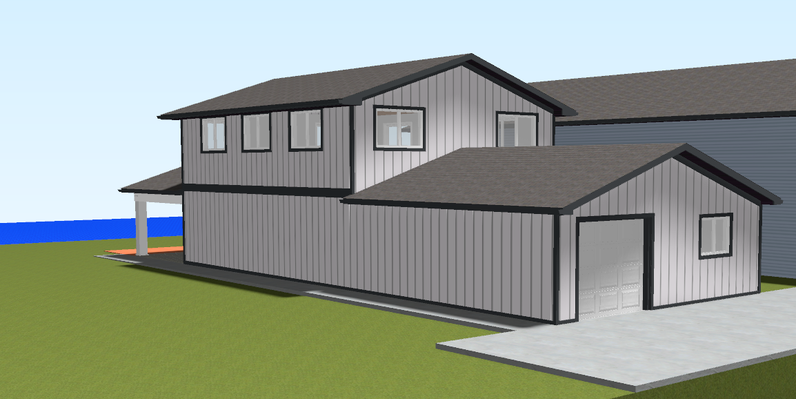 lake in background white steel siding white windows black trim keep building in back blue