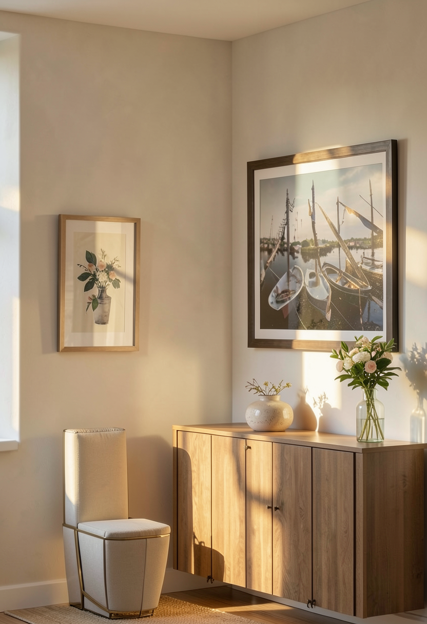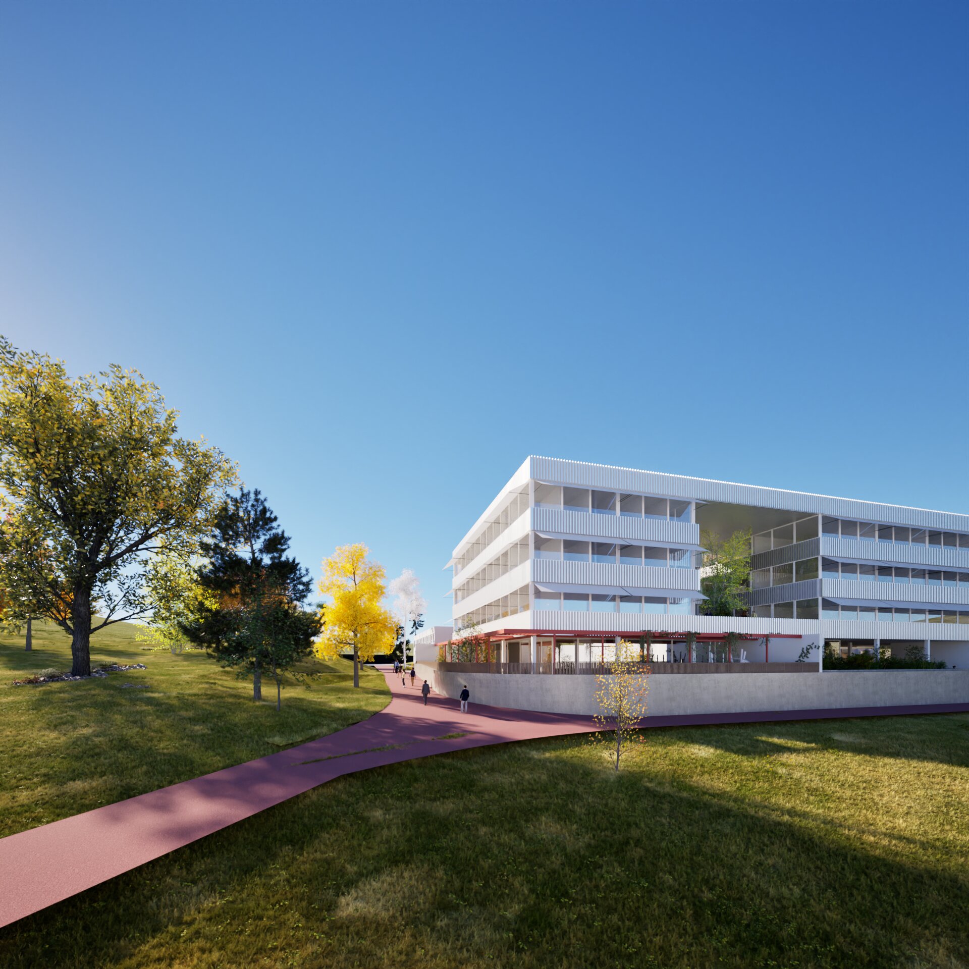 make photorealistic soft warm light with some clouds fasade in striped metal with soft gloss warm light inside the building lots of big trees on both sides of the building higher grass with white flowers people walking red sidewalk change for red fine gravel sidewalk