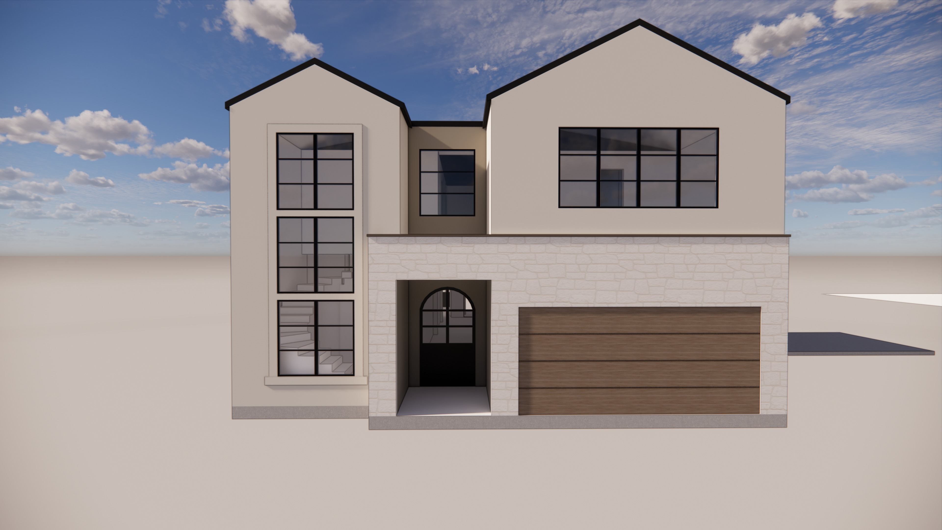 help me make this exterior better i want this to read elegant and high end but cleana and modern altern the materials as needed and show me how i can add to the top right facade without it being to much