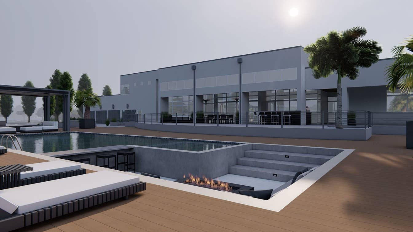 dark brown ipe decking where you see wood light gray stucco four house walls charcoal gray for gutters and house trim modern concrete for the pool
