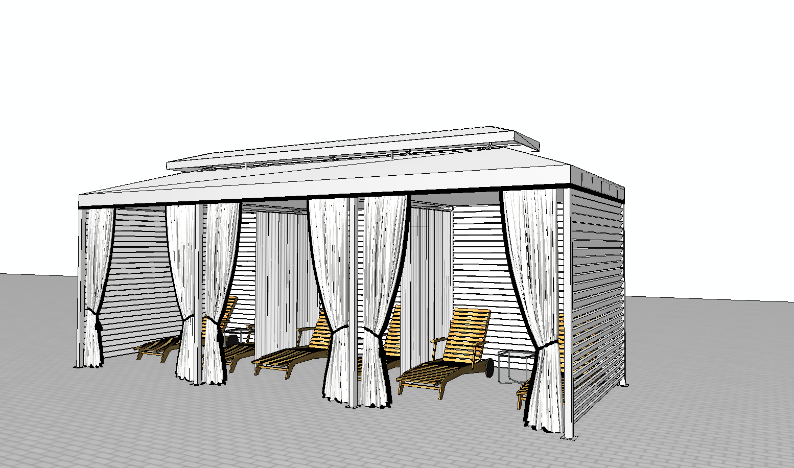 a photorealistic rendering of the exact same canopy structure shown in the reference a white aluminum pergola with a solid white canopy roof featuring a black contrasting trim white heavy curtains with black trim on all sides and the same slatted side walls all proportions positions geometry openings layout and structural elements must remain 100 identical to the original object no changes no additions no redesign no moving or removing elements the same loungers inside must remain in the exact same positions but now with striped black and white cushioned mattresses and matching pillows placed neatly on them the canopy is located outdoors on the property of a luxury hotel in west palm beach florida the environment is realistic and high end palm trees manicured landscaping bright sky soft coastal sunlight reflections clean stone flooring and elegant white hotel buildings in the background the scene should feel premium calm and resort like lighting bright daytime soft shadows clean highlights style ultra realistic crisp details high resolution textures angle same camera angle and perspective as the reference do not alter the structure design shapes layout or curtain placement only make the image photorealistic and add the luxury hotel environment around it