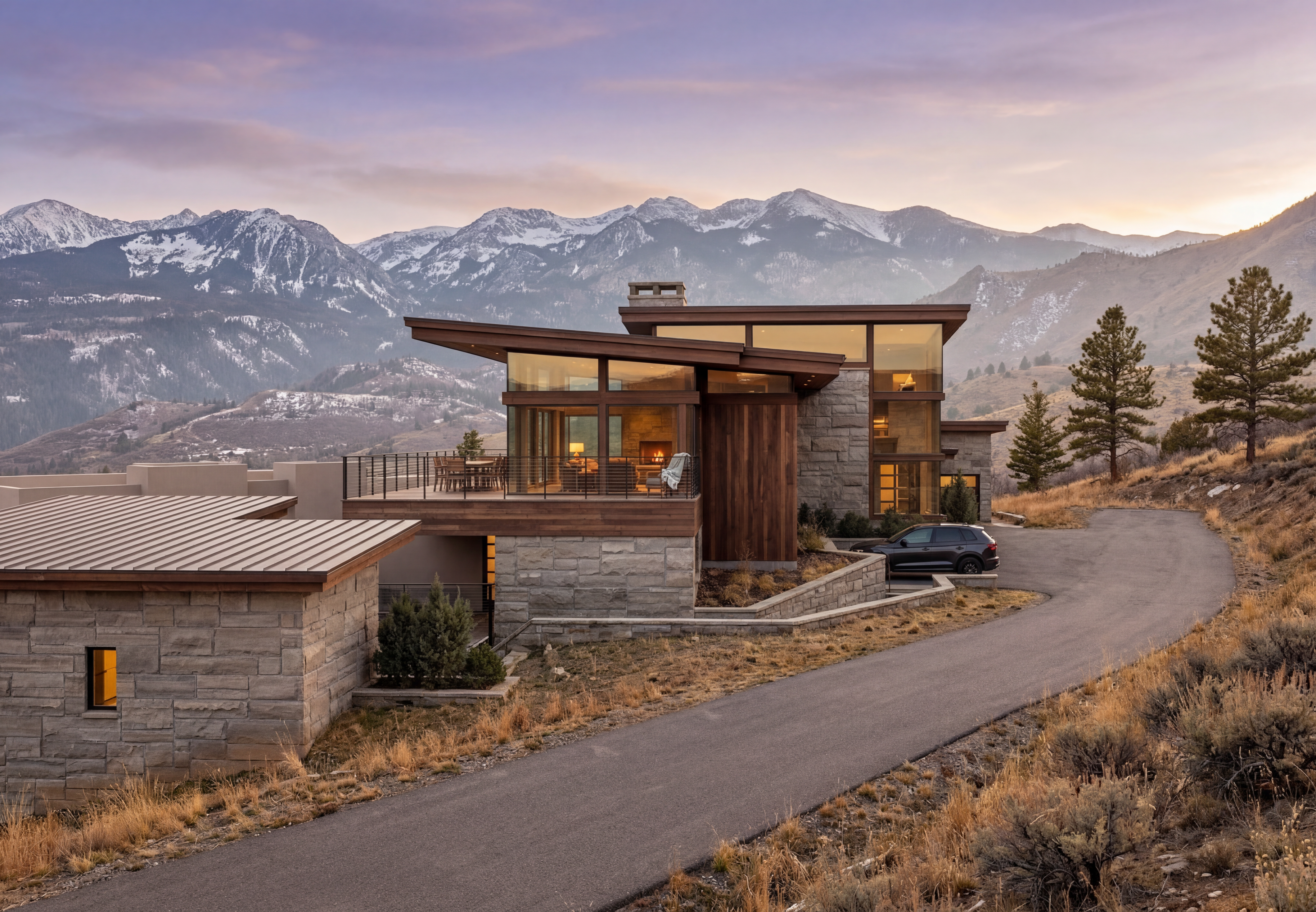 forest setting black driveway infront of garage doors only less landscaped front