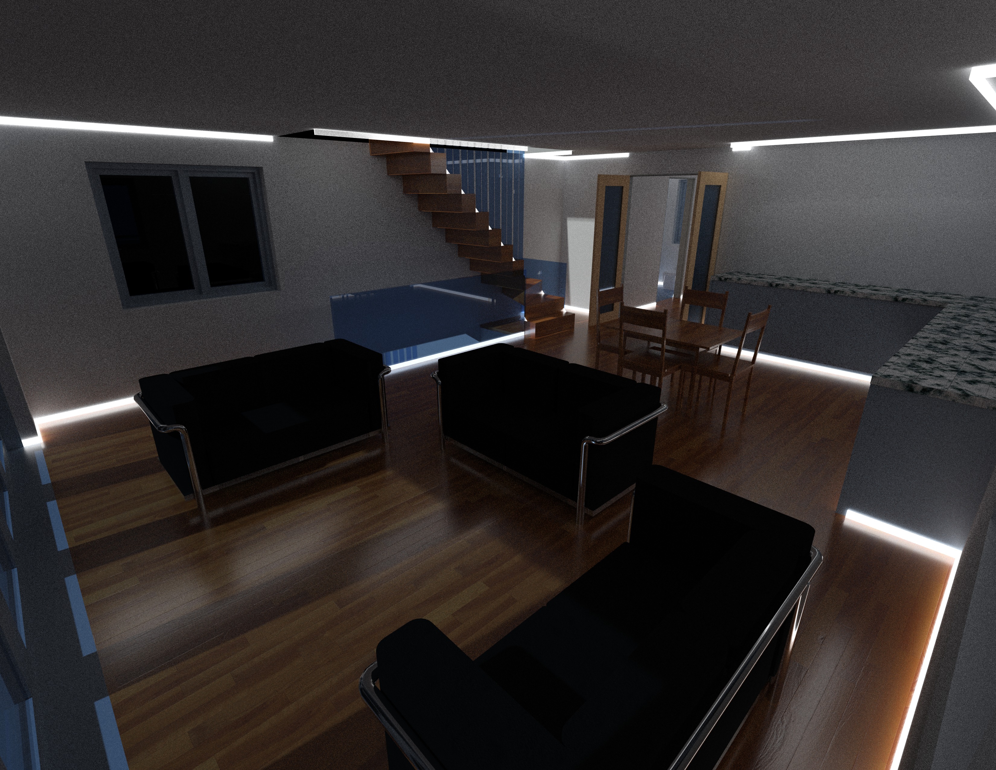 add pictures to the walls set the table ready for a meal and make the kitchen look better by adding a sink a tap place a coffee table between the sofas and a bottle of wine and four glasses on it add some throws to the sofas