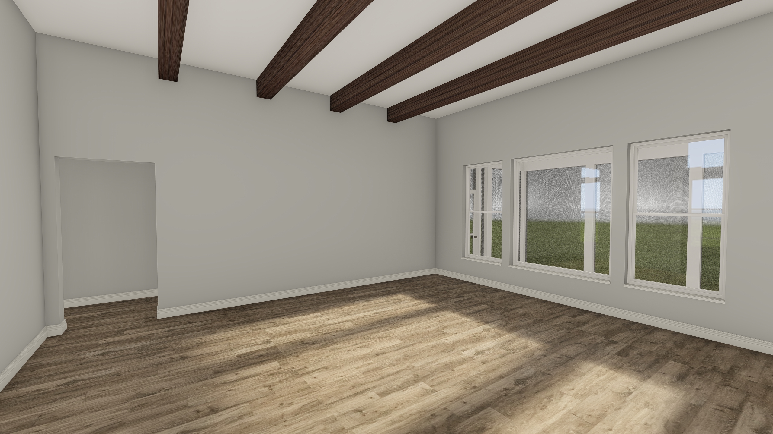 add warm lighting and a typical backyard scene with trees in the windows but obscured by trees