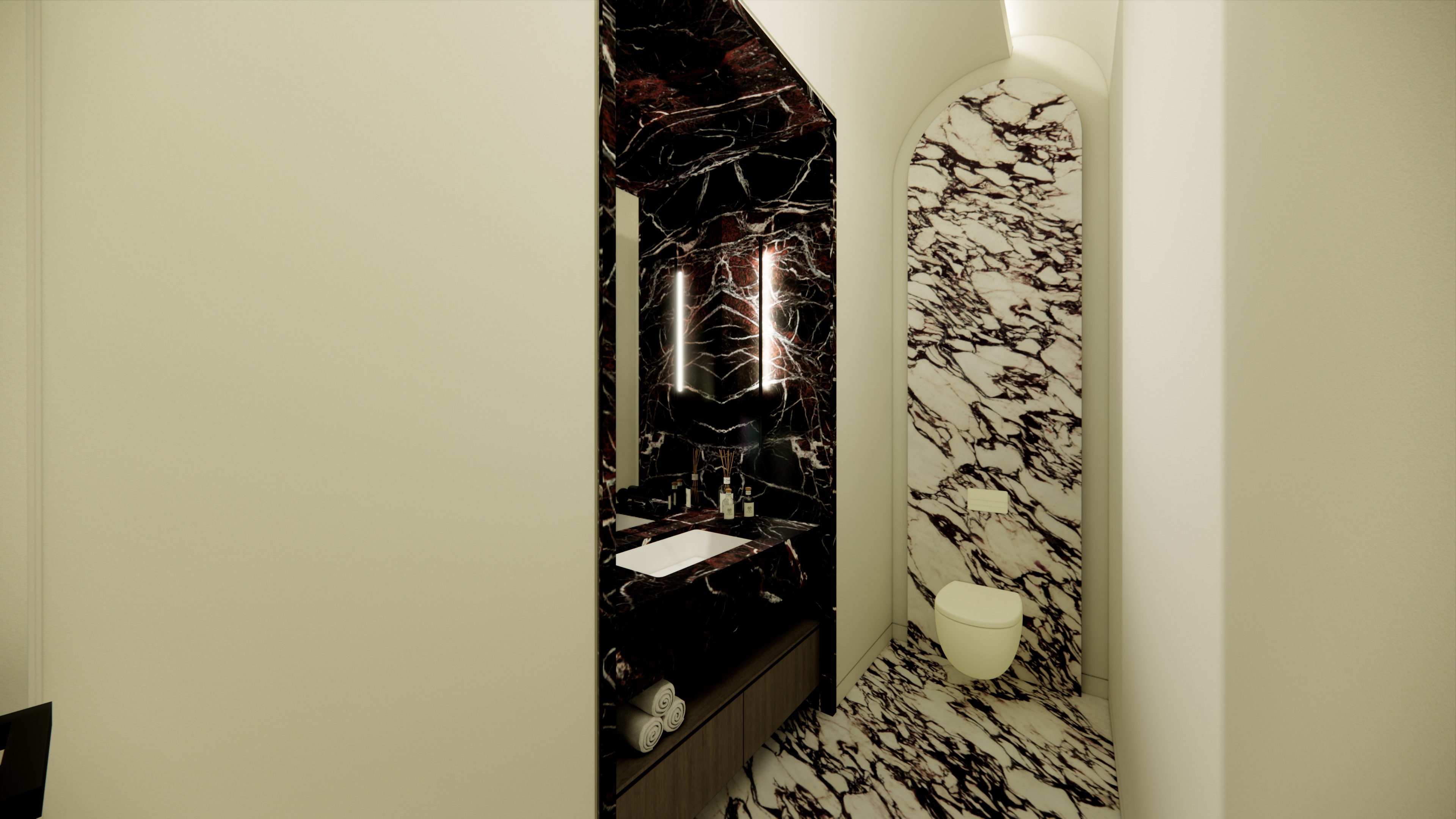 make the light below of red sink and cabinetry keep the colour of the veining of the floor and wall behind the toilet but make it a little bit lighter