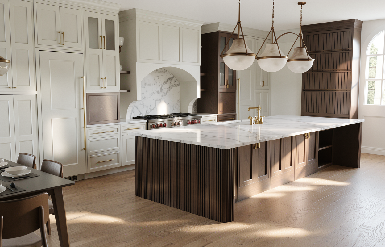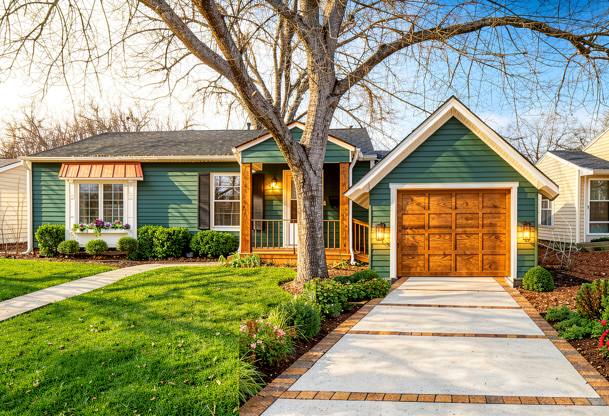 building is beige with dark roofing patio with a pool on the foreground and 4 laying chairs and a fireplace in the middle backgrounds has grass and trees warm tone at golden hour and soft shadows