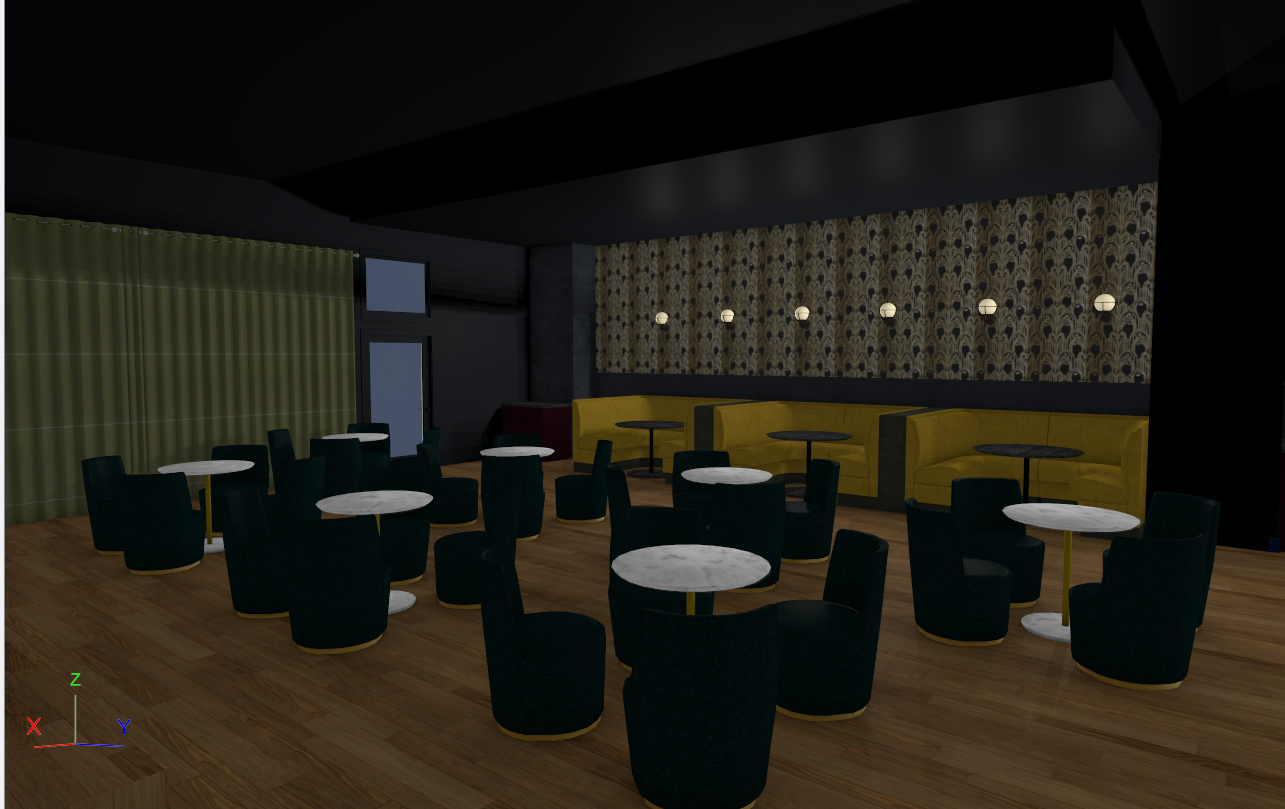a cozy elegant lounge with a warm and inviting atmosphere golden velvet booths contrasted by deep green armchairs the tables feature white marble tops and gold legs adding a touch of luxury the wooden floor has a dark herringbone pattern complemented by textured black and gold patterned wallpaper soft ambient sconces on the wall over the booths casting gentle glows on each surface creating a sophisticated and welcoming environment luxurious light green velvet drapery covers the large window