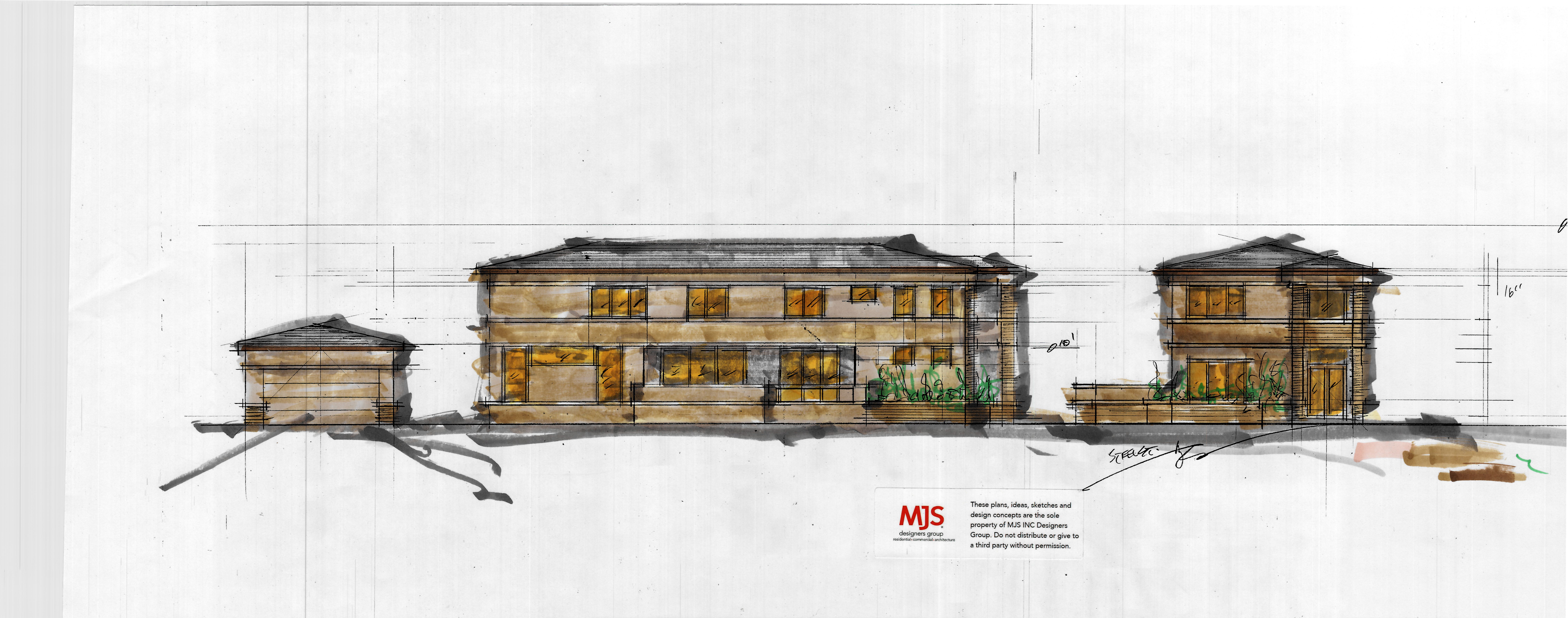this is a prarie style elevation reminiscent to the frank lloyd wright style using warm colors and rich wood accents